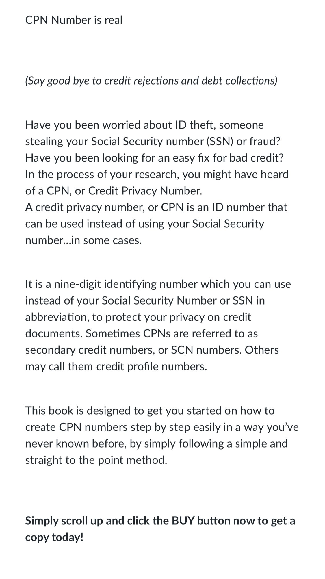 It is a nine-digit identifying number which you can use instead of your Social Security Number or SSN in abbreviation, to protect your privacy on credit documents. Sometimes CPNs are referred to as secondary credit numbers, or SCN numbers. Others may call them credit profile numbers.