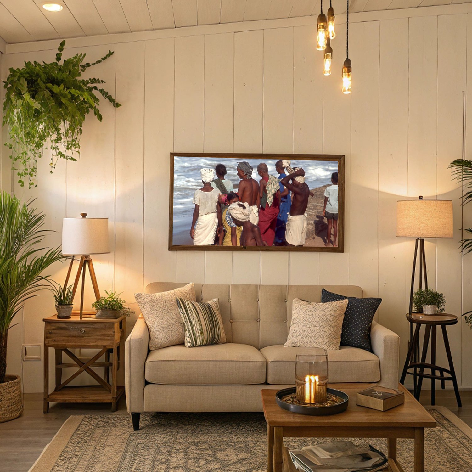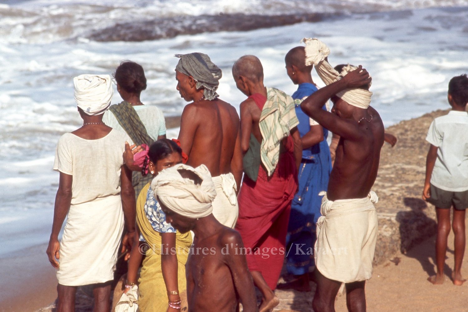 India photography, vintage India, coastal India, 1960s South Asia, Tamil Nadu, village life, seaside ritual, Robert Kayaert, documentary photography, historical archive, retro travel image, colorful sari, traditional attire, India art print, digital photo download