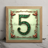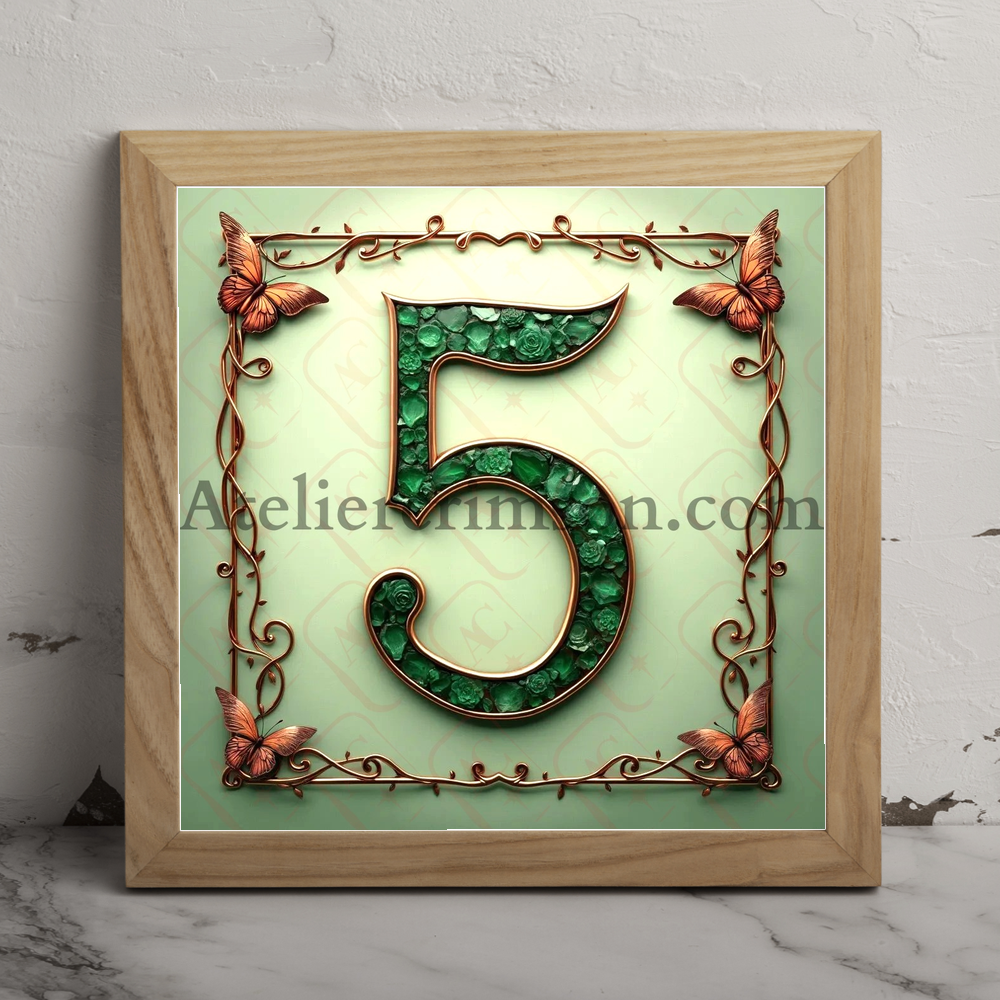 Number 5 emerald and copper Art Nouveau Intricate design with floral patterns, butterflies, and vines. Elegant sage green background. Perfect for vintage lovers and typography enthusiasts.
