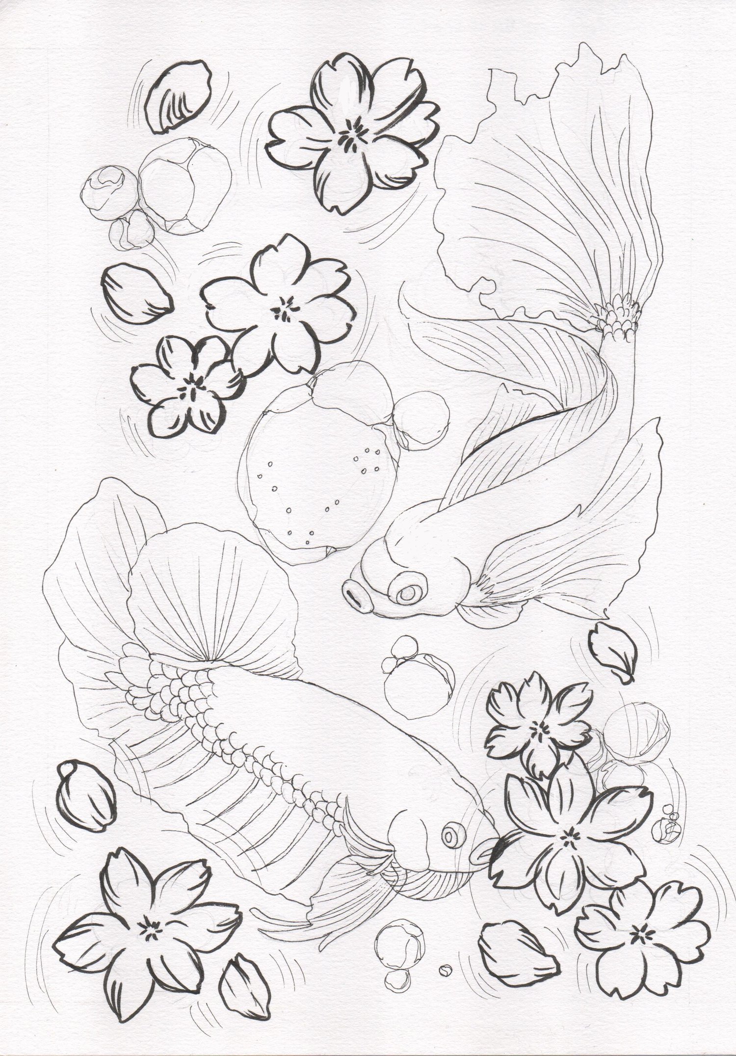 This depicts two fishes in a pond, where some flowers float on top.
