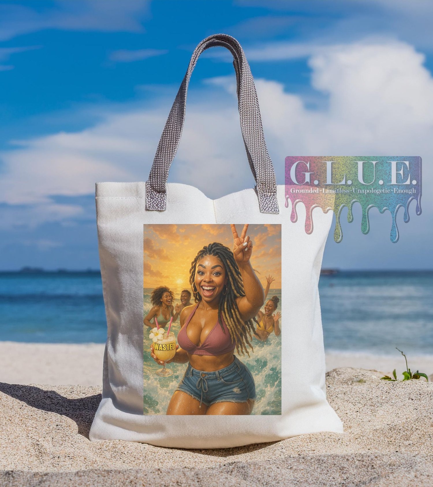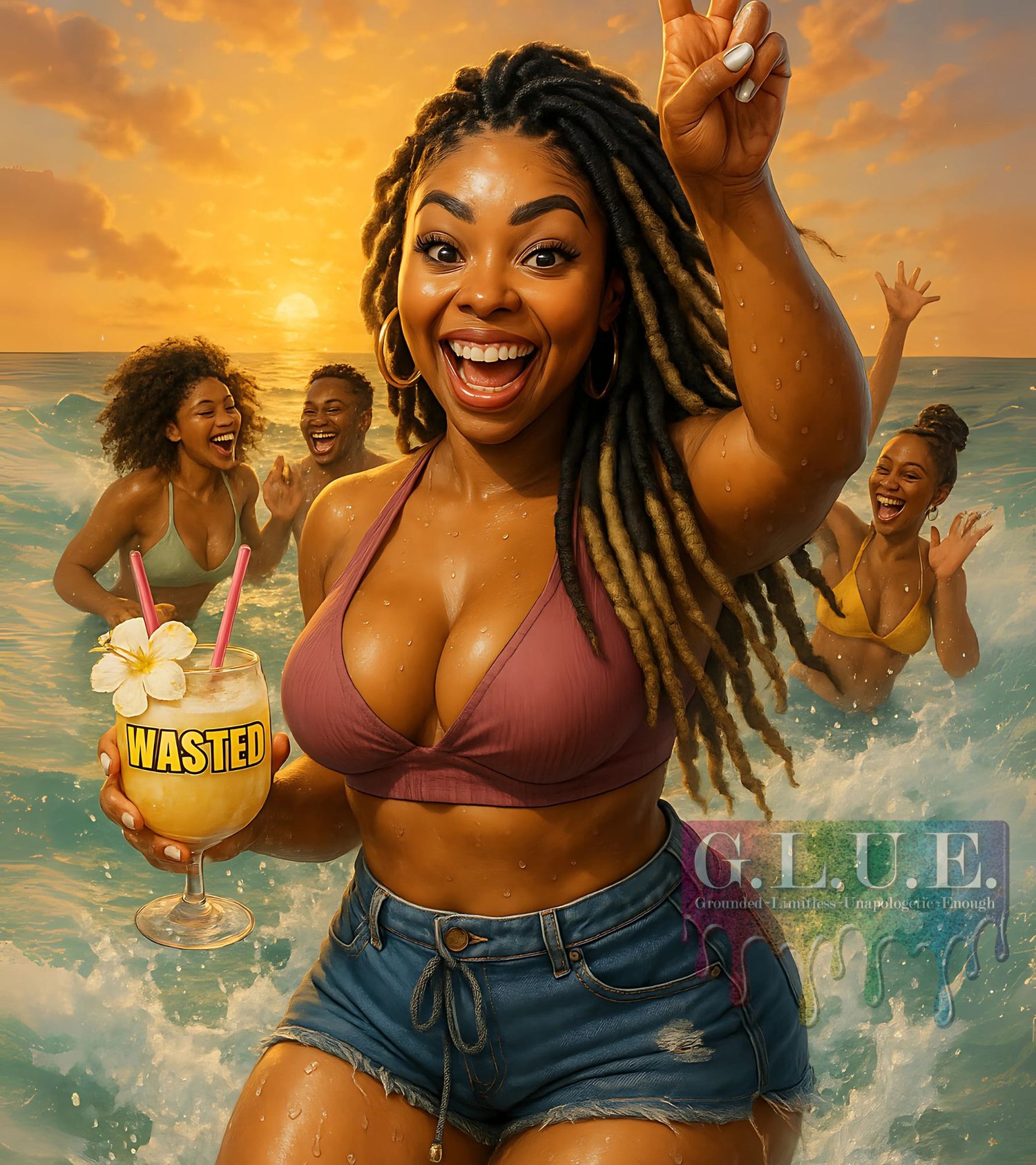Make waves with this stunning 4K hyperrealistic beach party illustration! This artwork captures a confident, curvy Black woman with flowing black-and-blonde ombre locs, wearing a mauve bikini top and sporty denim shorts, standing in sparkling ocean water. She holds a tropical cocktail labeled “WASTED” with pink straws and a flower garnish, flashing a playful peace sign. Behind her, friends are laughing and splashing under a golden sunset, radiating summer vibes and tropical fun.
