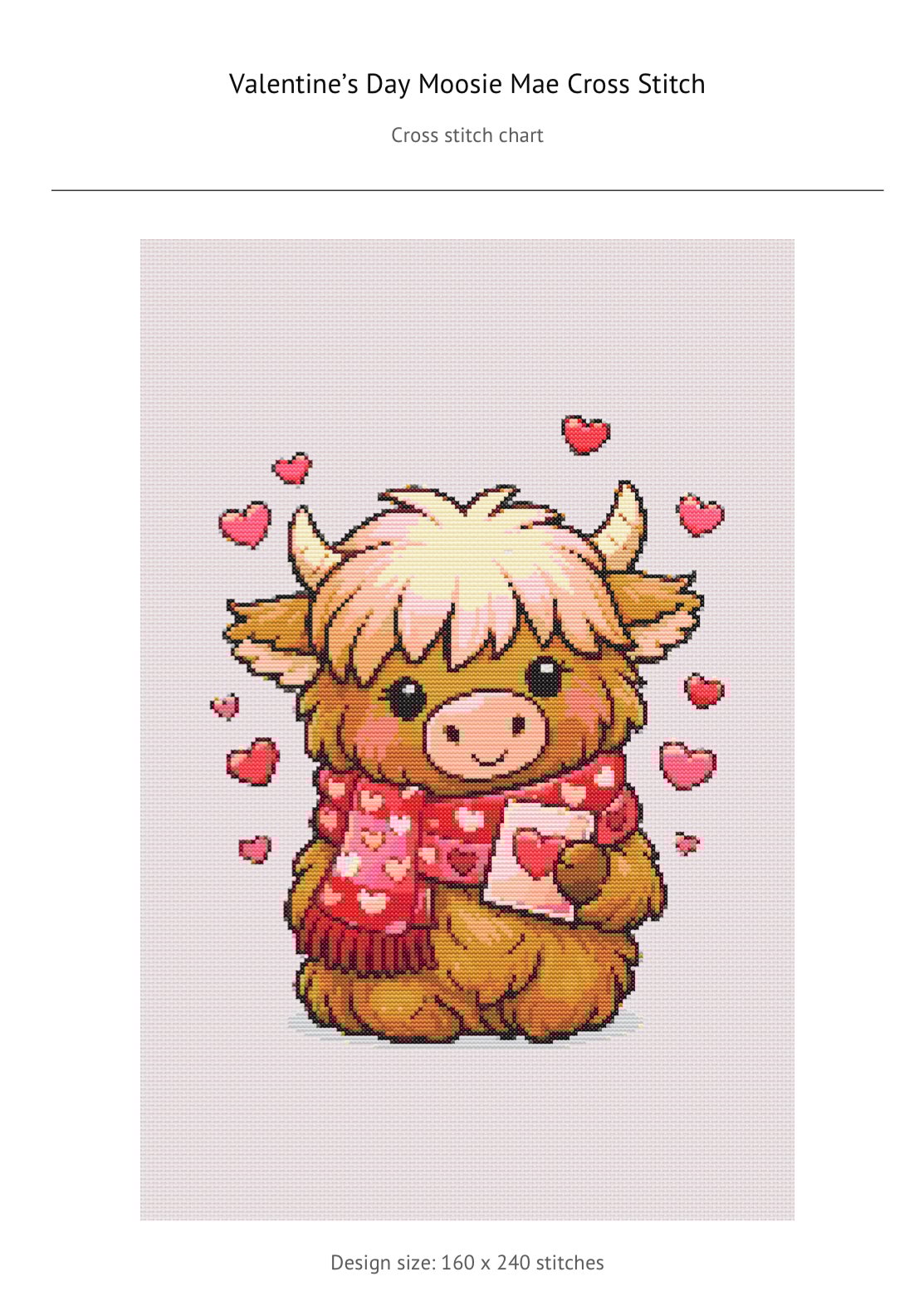 Valentine’s Day Highland Cow Cross Stitch Pattern – Cute Kawaii Cow with Hearts – Moosie Mae PDF Chart – Beginner Friendly 160x240 Stitches