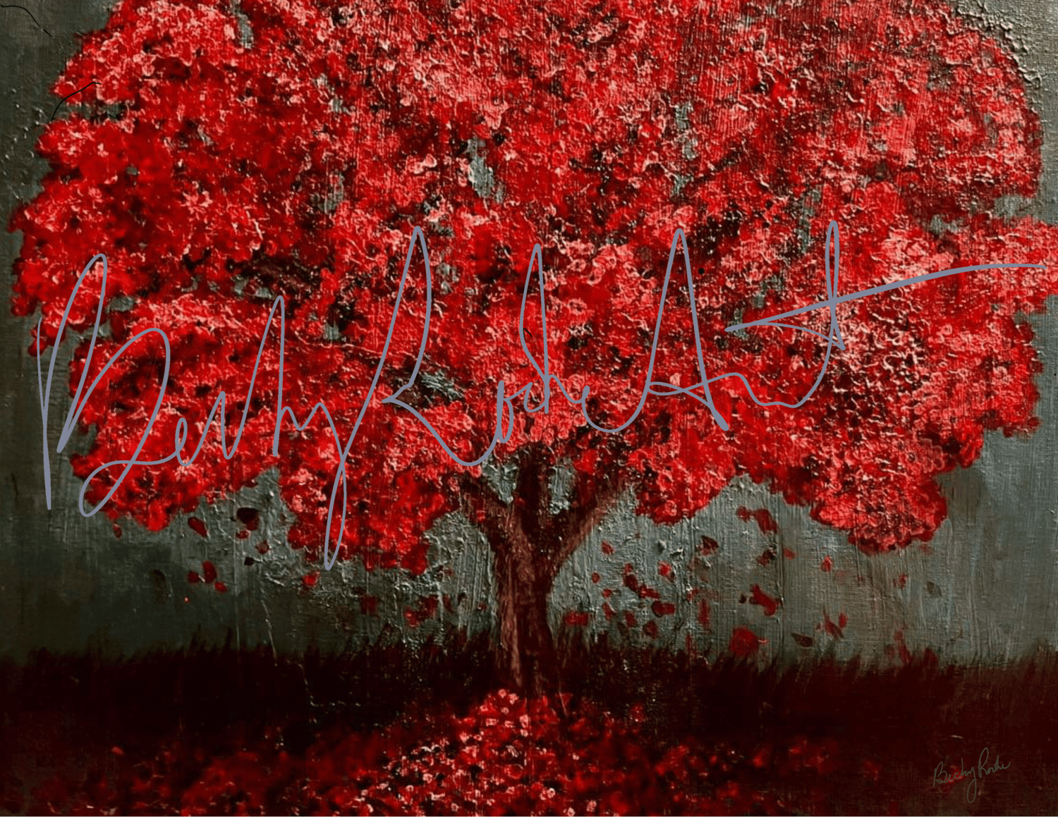 This piece began as an original acrylic painting and was later digitized and refined to preserve the depth, texture, and light of the painted surface. The red tree stands steady while its leaves fall and cascade beneath it like embers drifting down—warm, moving, and unmistakably alive.