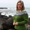 Sweater graded to S (M, L, XL, 2X) [3X, 4X, 5X] Sizes,with finished bust measurements: 38 (42, 46, 50, 54) [58, 62, 66])” / 96.5 (106.5, 117, 127, 137) [147.5, 157.5, 167.5]) cm. Sample is 46”/117 cm worn with 3”/7.5 cm positive ease.