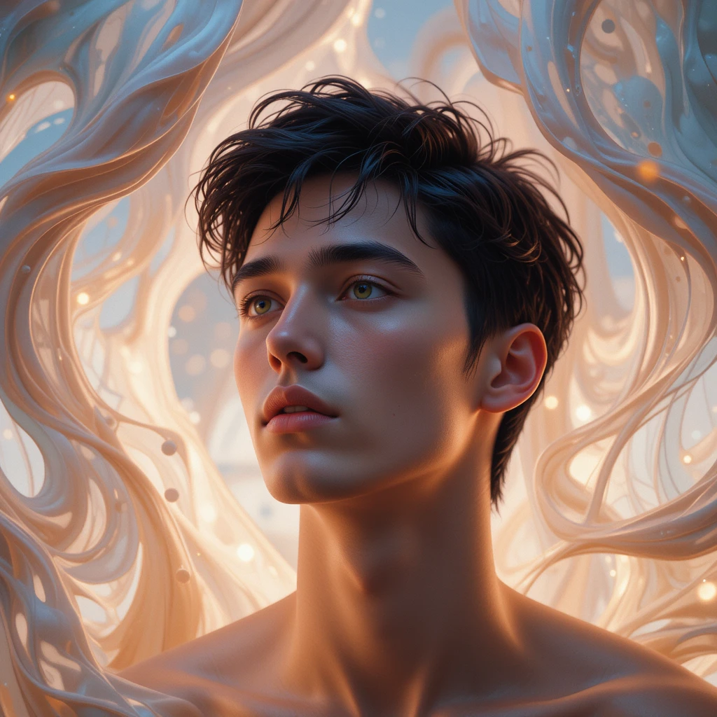 Ivory Lure is a hypnotic, high-resolution digital artwork created by Æther天神. This piece reveals an ethereal male enveloped in rose gold-toned ivory smoke that flows with the mesmerizing rhythm of a lava lamp. The soft metallic hues glisten across his divine form, creating a warm, sensual atmosphere — a trance of elegance and slow-burning allure.