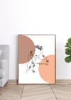 Beautiful modern line-art woman with flowers in her hair and flowers around her arm with abstract shapes on the background in modern colors brown and pink, and text “Self Love Club” in modern colors brown and salmon.