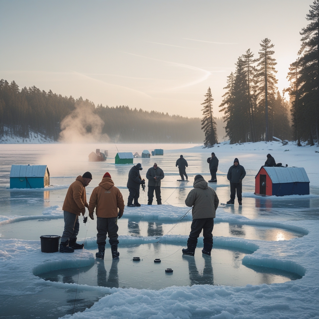 "A group of people ice fishing on a frozen lake during winter. They are dressed in warm winter clothing, gathered around small fishing holes cut into the thick ice, with colorful ice shanties scattered across the lake. Snow covers the surrounding landscape, and tall pine trees line the horizon. The scene captures the calm, quiet atmosphere of a frozen winter morning, with soft sunlight reflecting off the ice and subtle steam rising from the fishing holes. Some people are actively fishing, while others are chatting or tending to their gear, creating a cozy and peaceful winter outdoor scene."