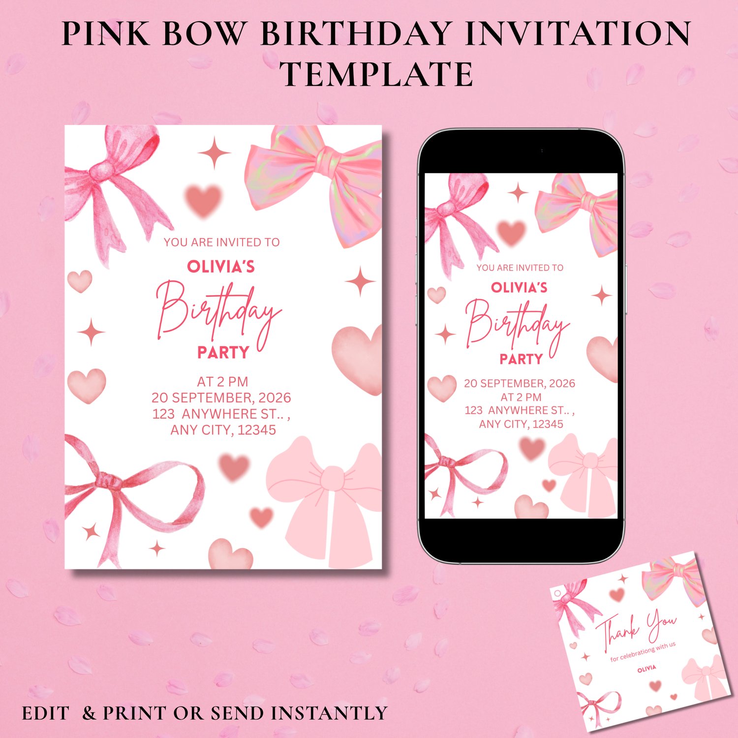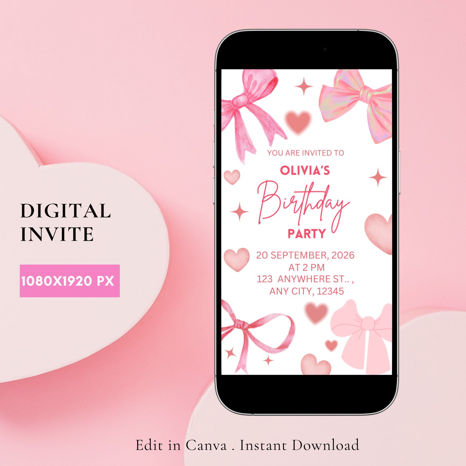 - Pink Bow Birthday Invitation Template 1080x1920px (perfect for phone sharing)