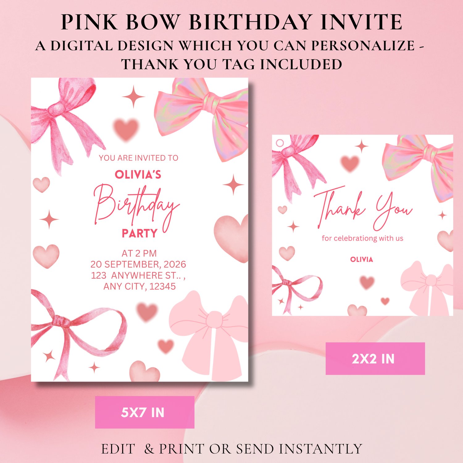 - Pink Bow Birthday Invitation Template 5x7 inches (perfect for printing)