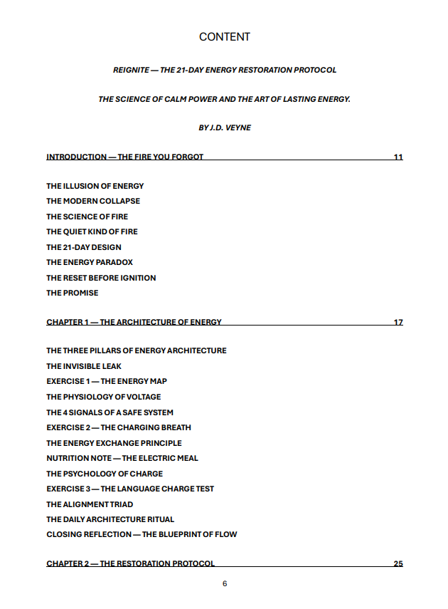 REIGNITE — The 21-Day Energy Restoration Protocol is the final volume of J.D. Veyne’s Reset Series — a synthesis of science, stillness, and structure designed to restore your natural vitality without burnout.