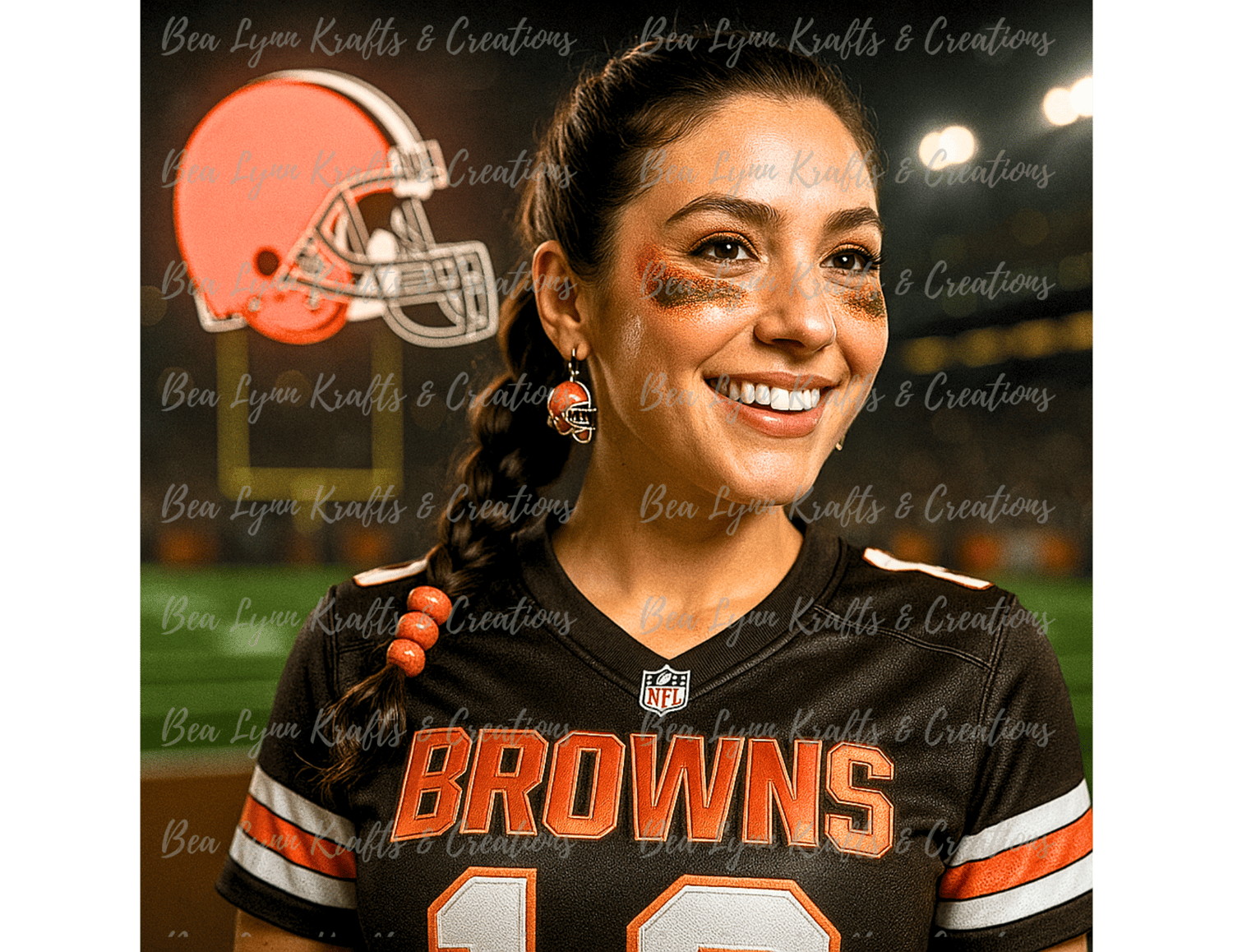 Capture the fearless energy of Cleveland Browns fans with this stunning transparent PNG featuring a smiling, game-day-ready female supporter! Decked out in face glitter, orange beads, team earrings, and an authentic Browns jersey, this image radiates loyal fan pride. Whether you're designing football party decor, POD apparel, or merch for your Etsy shop, this file brings serious Cleveland vibes to the field!