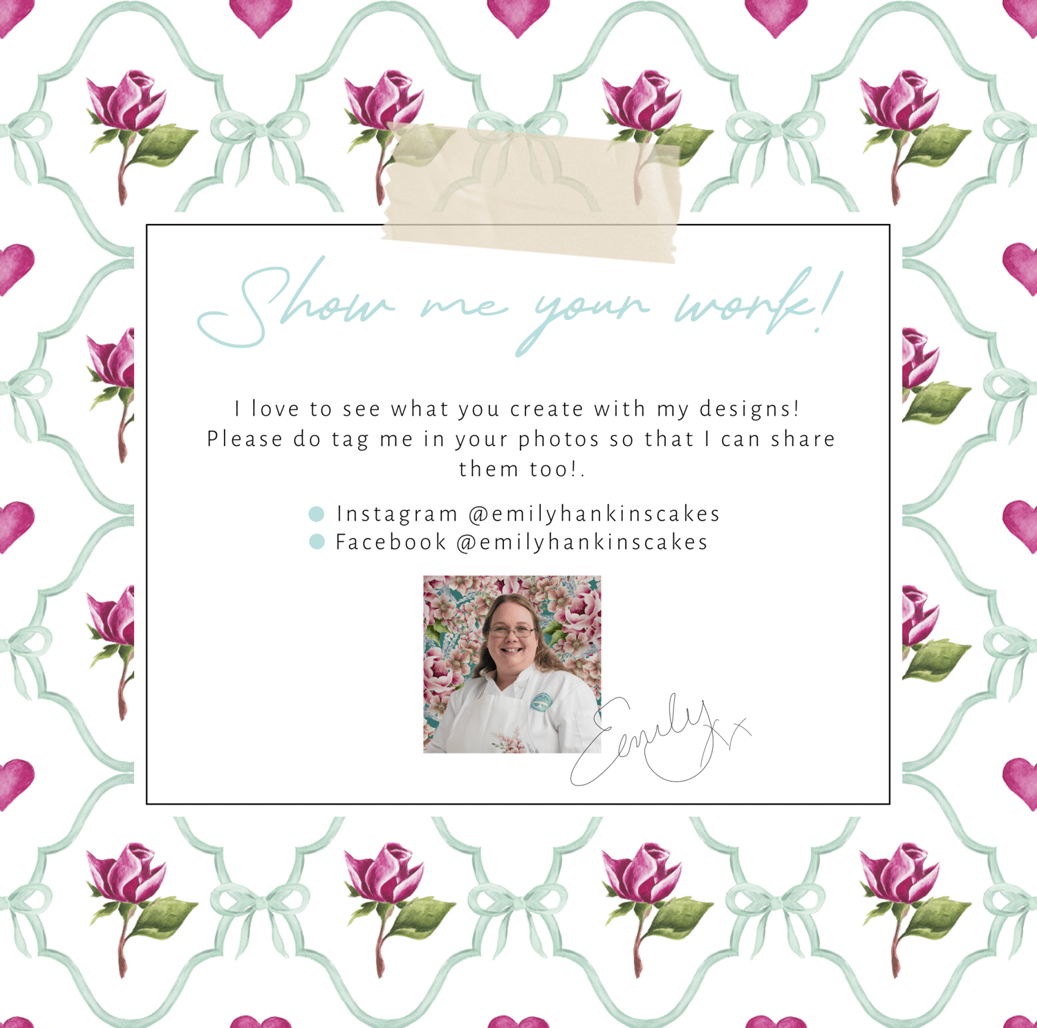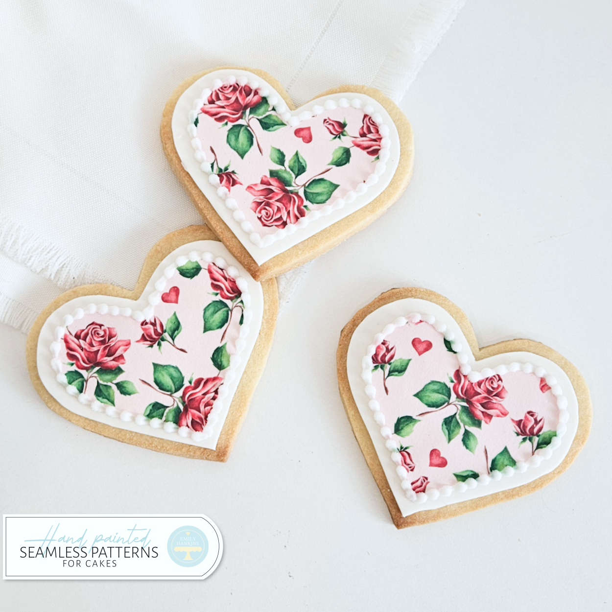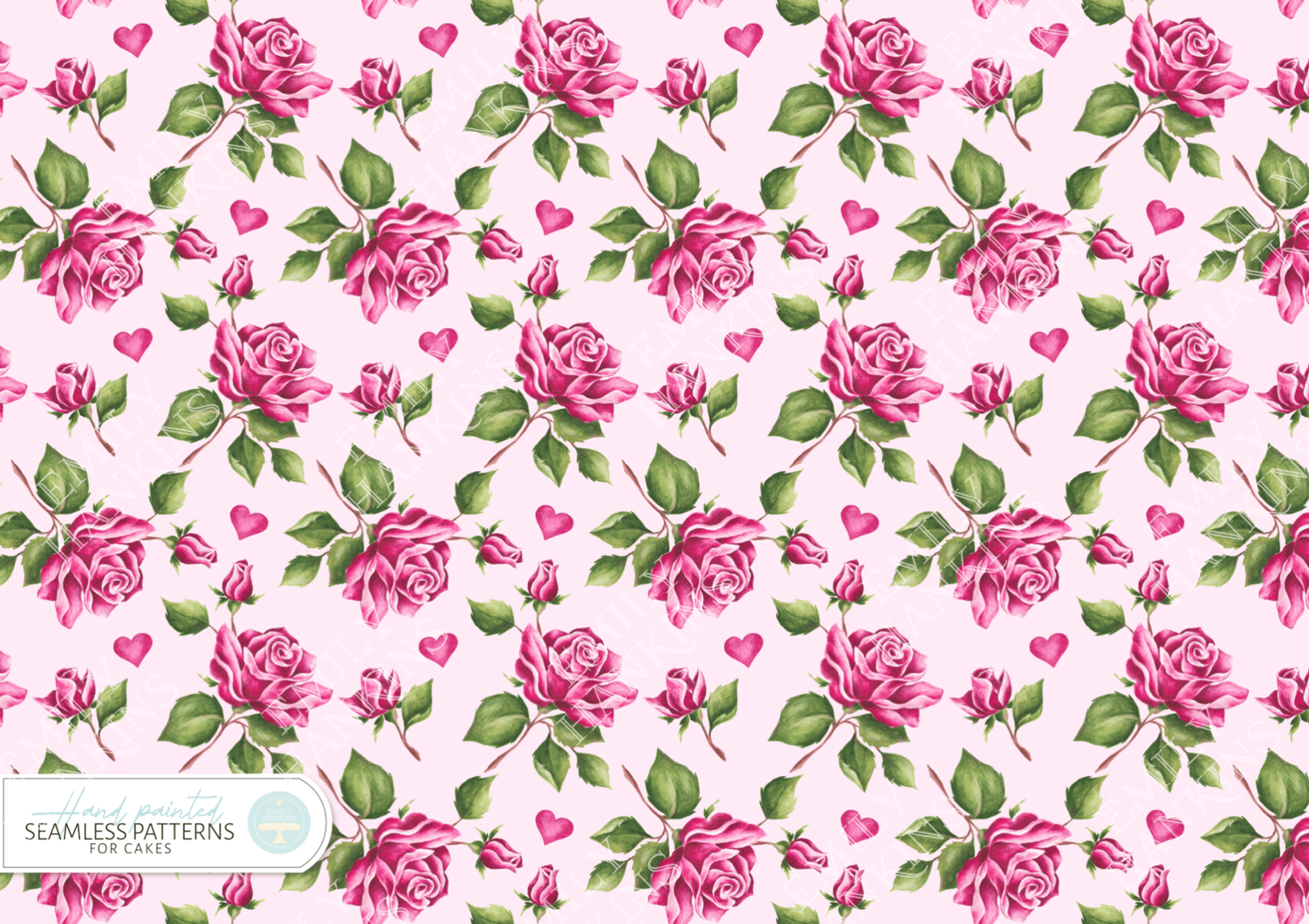 The design is a celebration of LOVE! It features roses, rose buds and hearts on a pink background. Each flower and design element has been hand painted by Emily and painstakingly crafted into a seamless pattern for your cake designs.
