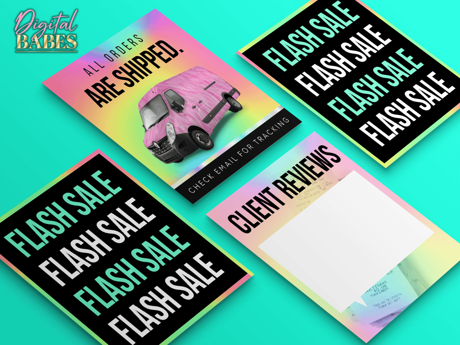 Each design features a striking rainbow gradient with clean, bold typography that’s fully customizable in Canva. Use them for your Instagram, website, Etsy shop, or customer service updates.