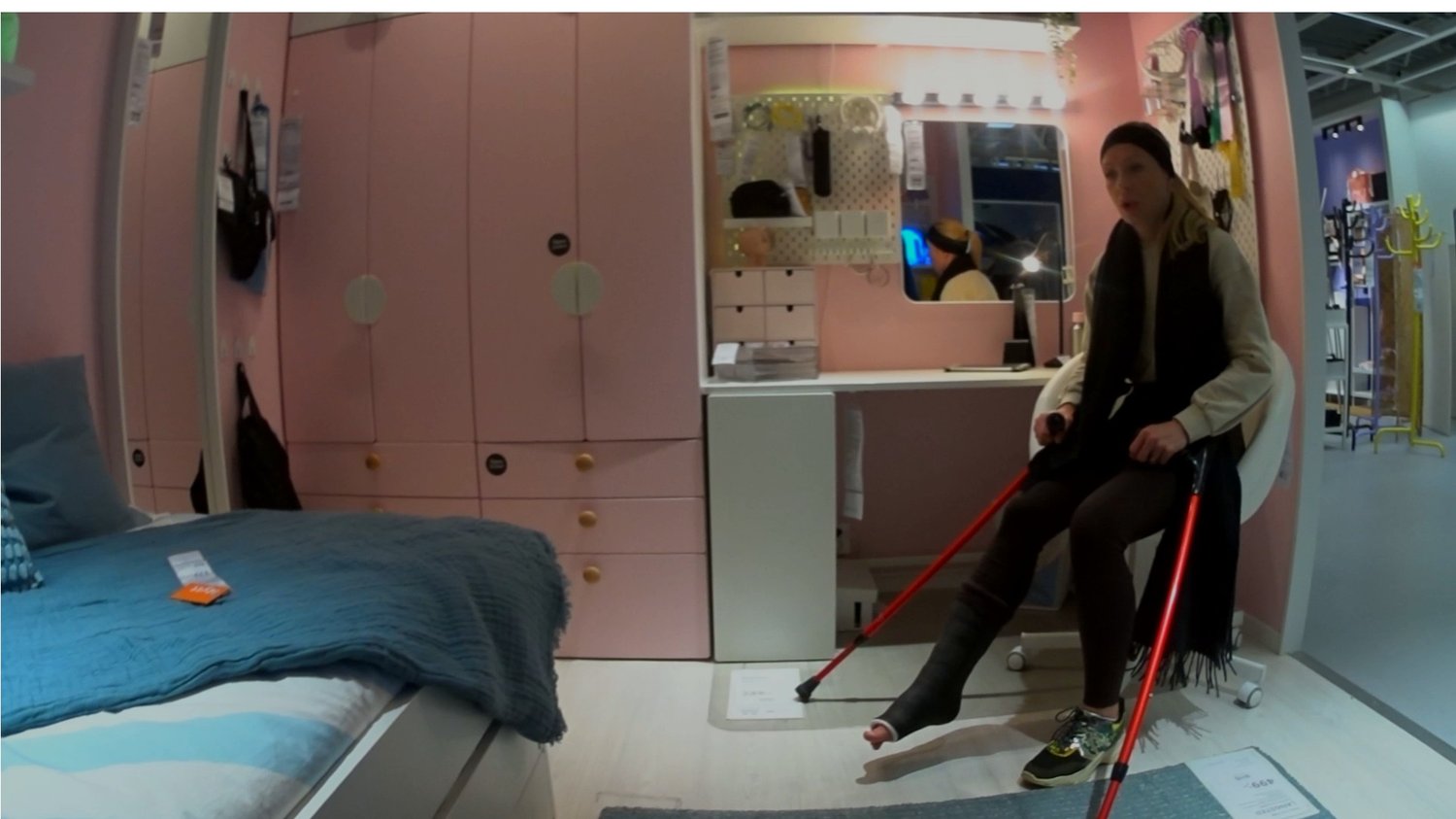 Let’s tag along as Kicki pays IKEA a visit today although her right leg is broken and clearly casted in a black SLC right now. She’s wearing a white sock on top of her casted foot to not drag attention to herself, but as far as it went, Kicki got hot quite fast and had to remove her sock. She is later seen crutching throughout entire IKEA just looking at stuff and trying furnitures out, nice and smooth closeups were made from time to time. Even injured people need to enjoy their free time and do some shopping too, Right?
