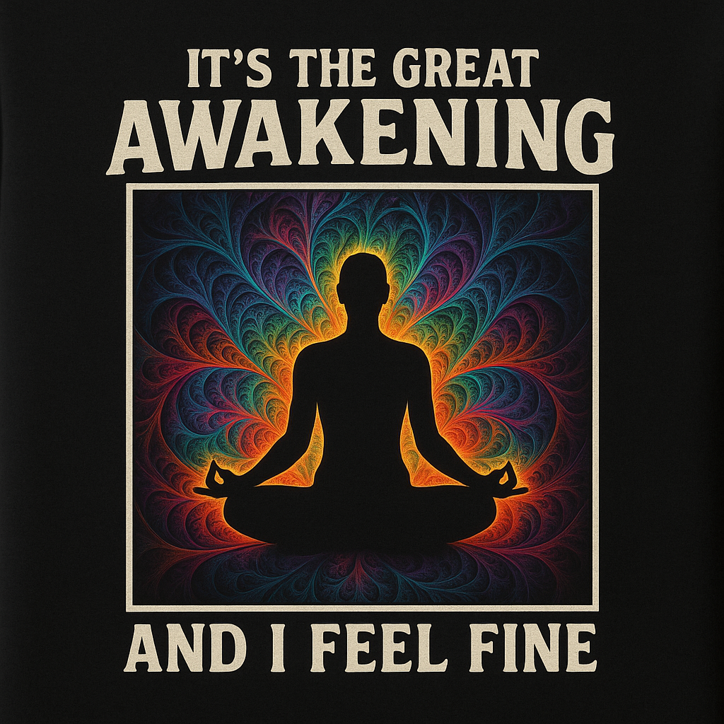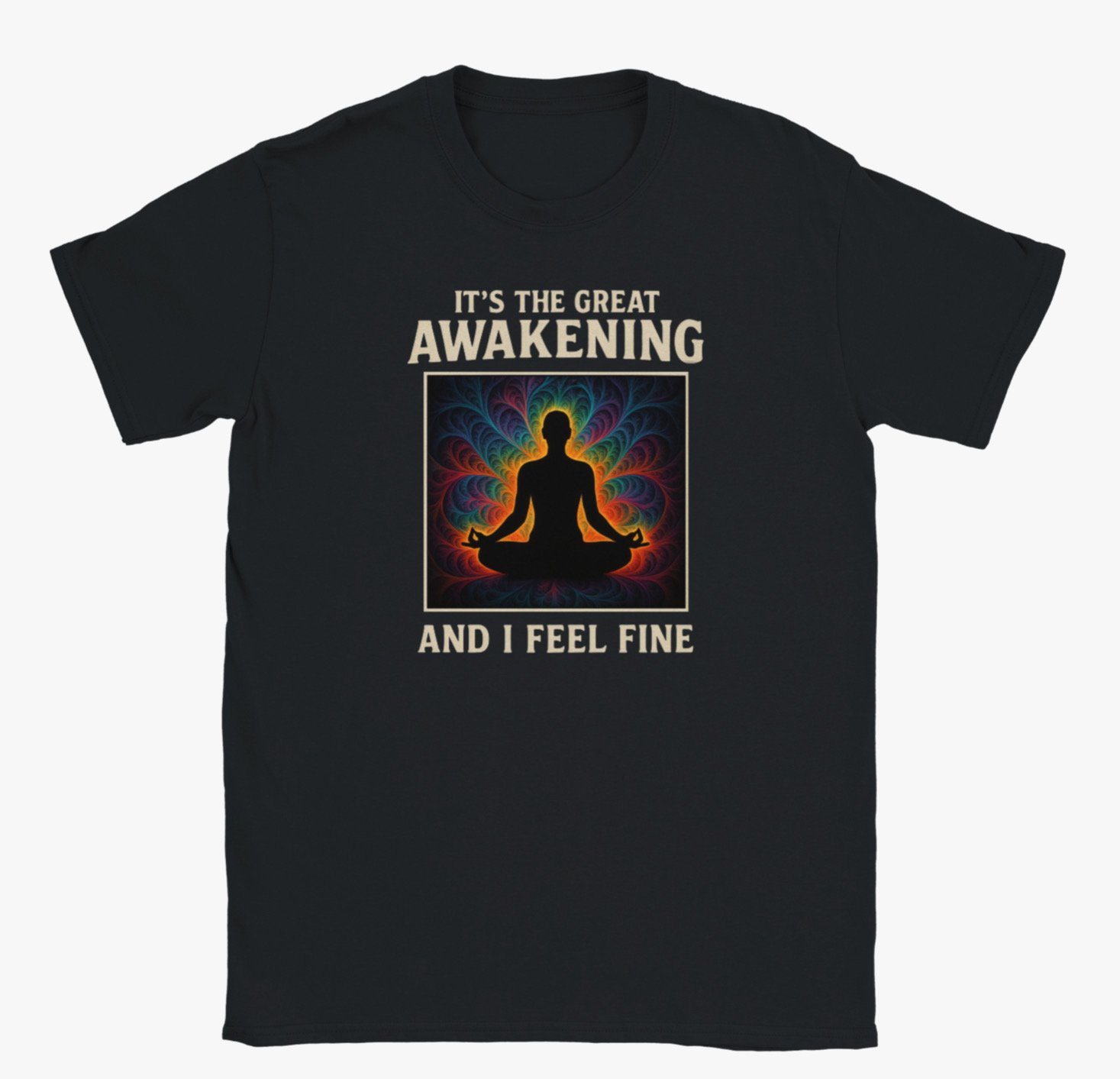 Embrace the Shift in Style and Spirit, Step into your power with this “Great Awakening” Spiritual T-Shirt, designed for anyone on a journey of self-discovery, mindfulness, and elevated consciousness. At the centre of the design is a serene silhouette in meditation, surrounded by a vibrant, fractal-inspired aura symbolising inner light, clarity, and expansion. The bold statement “It’s the Great Awakening and I Feel Fine” makes this tee both a conversation starter and a personal affirmation.