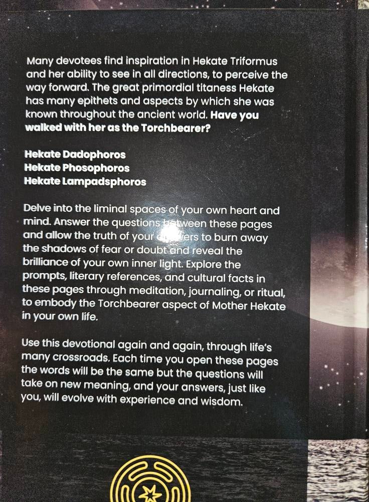Delve into the liminal spaces of your own heart and mind. Answer the questions between these pages and allow the truth of your answers to burn away the shadows of fear or doubt and reveal the brilliance of your own inner light. Explore the prompts, literary references, and cultural facts in these pages through meditation, journaling, or ritual, to embody the Torchbearer aspect of Mother Hekate in your own life.