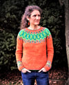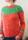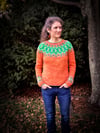 Orange You Glad (an ode to those corny knock-knock jokes of my youth) is a top down, long-sleeved pullover with gentle waist shaping that leads to a slight A-line silhouette. Fair isle patterning adorns the yoke and sleeves. Contrasting color is used in the neck cast on and sleeve and body bind offs. Instructions for the fair isle patterns are both written and charted. Additional charts with no colors are included at the end of the pattern so that if you wish, you may color in the charts to match the yarn you’ve chosen. German short rows are used to shape the neckline after the fair isle yoke pattern is completed.