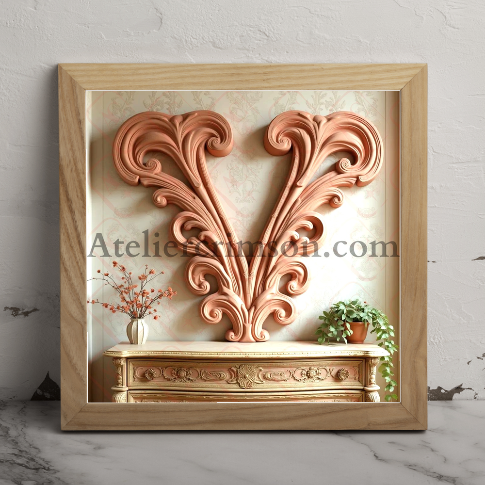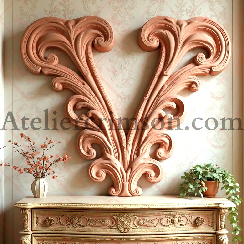 The letter V terracotta Art Nouveau typeface inspired by Alphonse Mucha's with flowing lines and floral motifs, set against a soft, muted background with a gilded wooden dresser and subtle lighting effects.