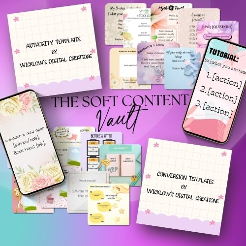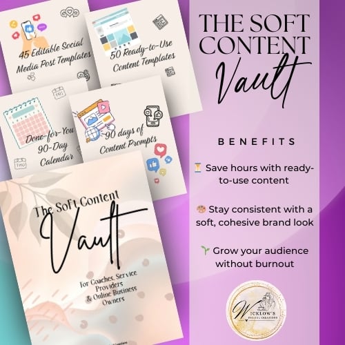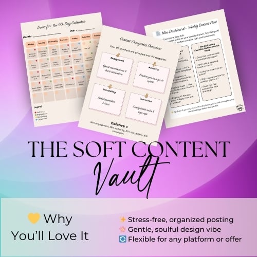 This gentle vault includes softly-structured prompts, editable caption starters, Canva templates, and an intuitive batching guide — all designed to match your natural rhythm and values. It’s your cozy alternative to rigid content calendars and hustle-heavy posting.