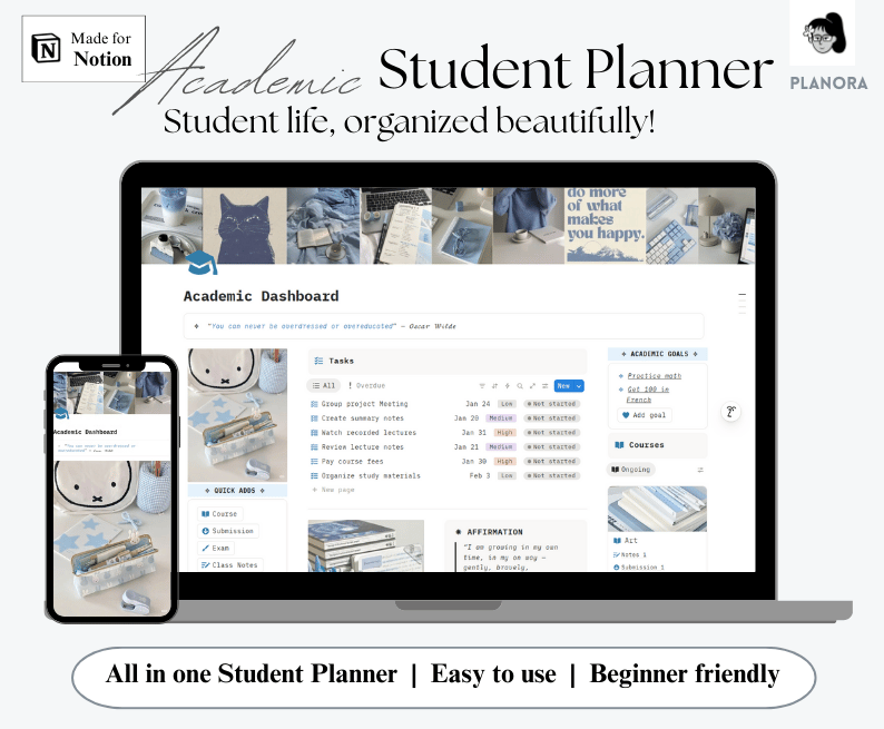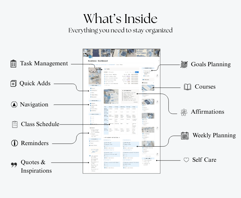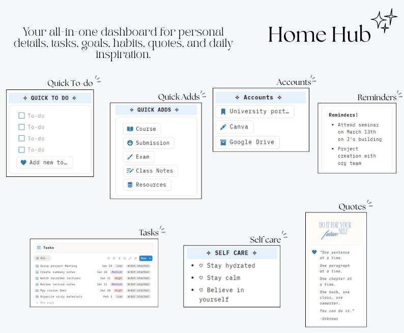 An all-in-one academic dashboard designed to help students plan smarter, stay organized, and remain consistent. Track tasks, courses, schedules, goals, and self-care in one clean, calming workspace. 💙
