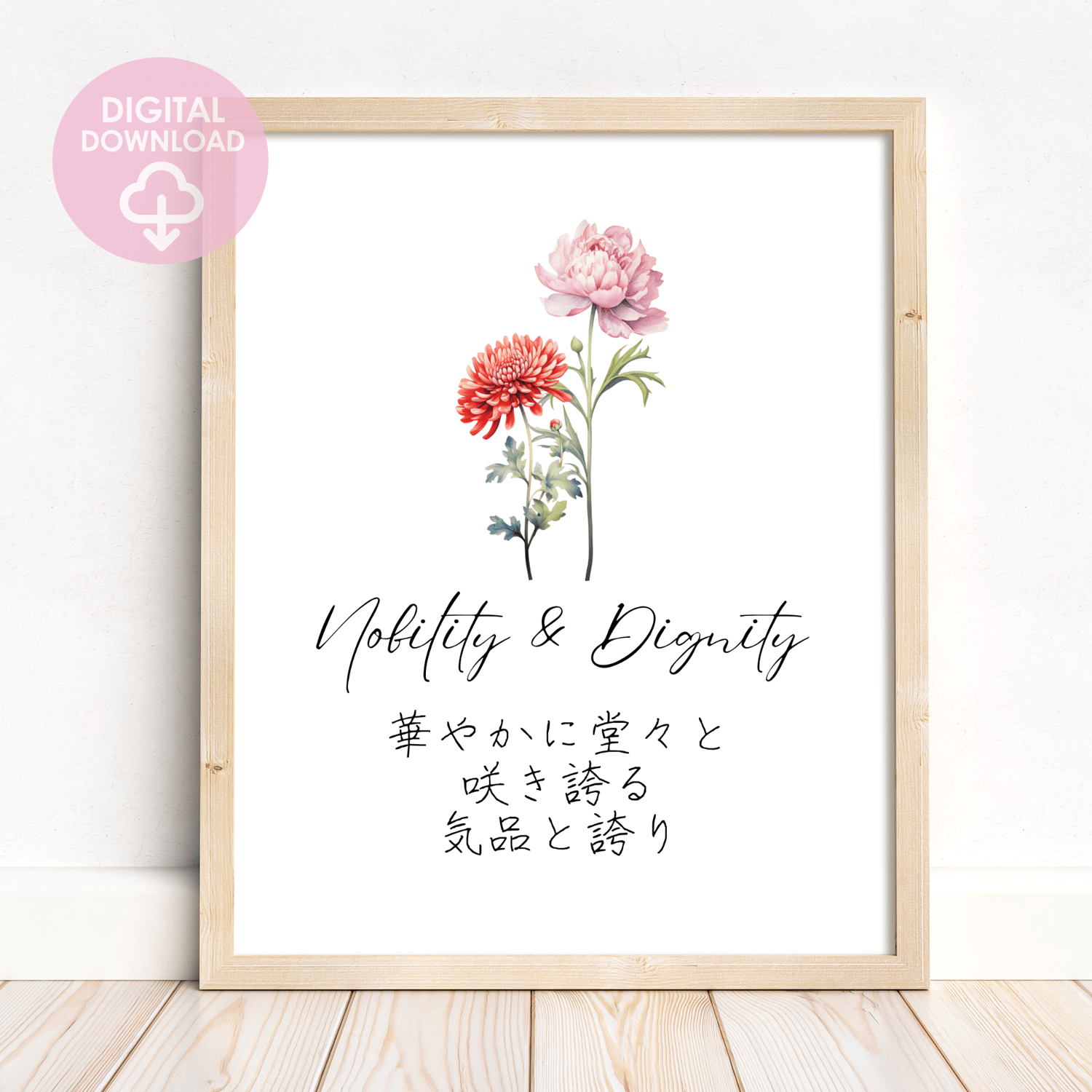 Printable Novermber Birth Month Flowers Art Print, Japanese Quote Room Decor