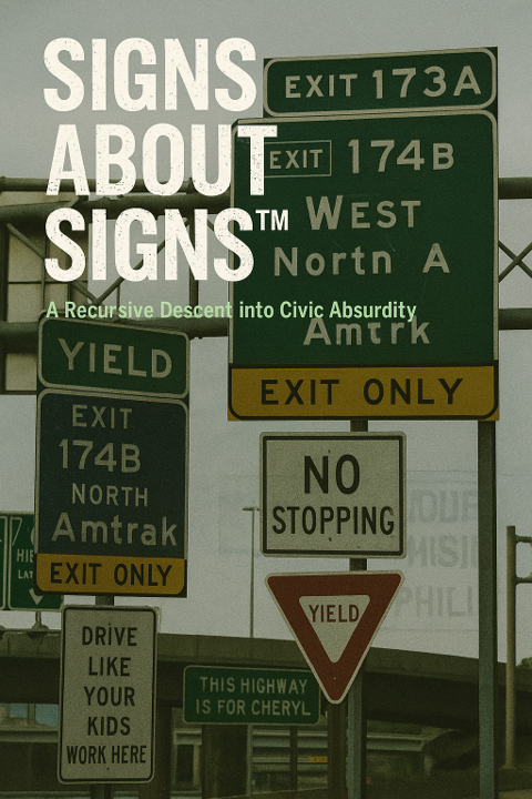 SIGNS ABOUT SIGNS™ is a semiotic fever dream of highways as infinite scrolls. Exit ramps become paradoxes, traffic signs morph into scripture, and PSAs collapse into push notifications. Part anthology of absurd signage, part cultural prophecy, it’s designed as a printed art object, live-reading series, or poetic installation. The book reimagines navigation as ritual repetition—where the map is not the territory but the feed itself.