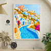 Inspired by the iconic charm of Greece’s most beloved island, this artwork reflects that dreamy Mediterranean lifestyle — think domed rooftops, Aegean blues, and breezy island elegance.