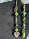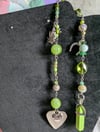 Handcrafted with green glass beads, purple glass swirled accent beads, metal lucky horseshoe charms, metal guitar pick charm, metal motorcycle charm, and pot leaf charm. Each pendulum is a one-of-a-kind creation hand crafted to create a unique and special look.