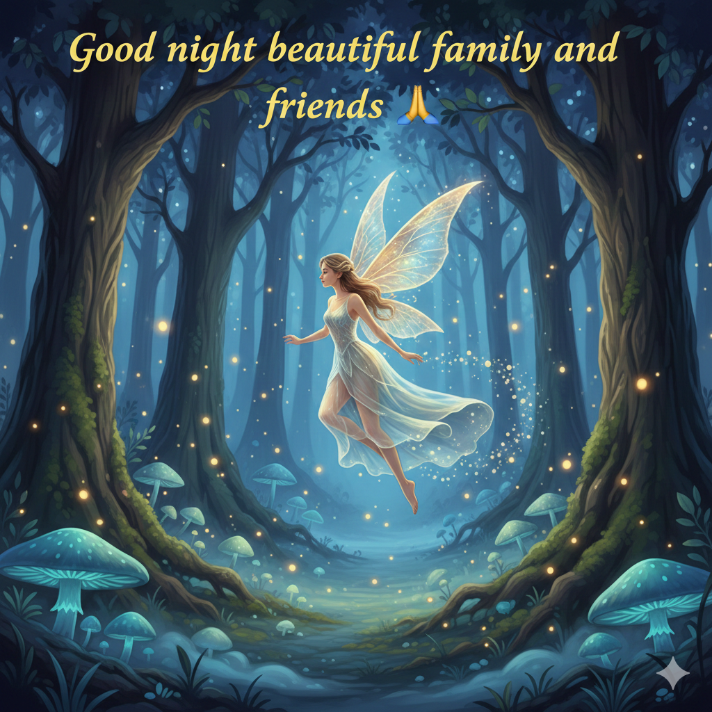 A beautiful good night fairytale scene of a delicate glowing fairy flying gracefully through an enchanted forest at night, sparkling wings shimmering with soft golden and silver light, long flowing dress made of light and mist, surrounded by tall ancient trees with twisted branches, glowing mushrooms on the forest floor, soft blue moonlight filtering through the leaves, fireflies floating in the air, tiny magical sparkles trailing behind the fairy, a dreamy mist covering the ground, deep navy and purple night sky visible between the trees, peaceful and magical atmosphere, ultra-detailed, fantasy illustration, cinematic lighting, soft glow effects, 8K resolution, storybook art style.
