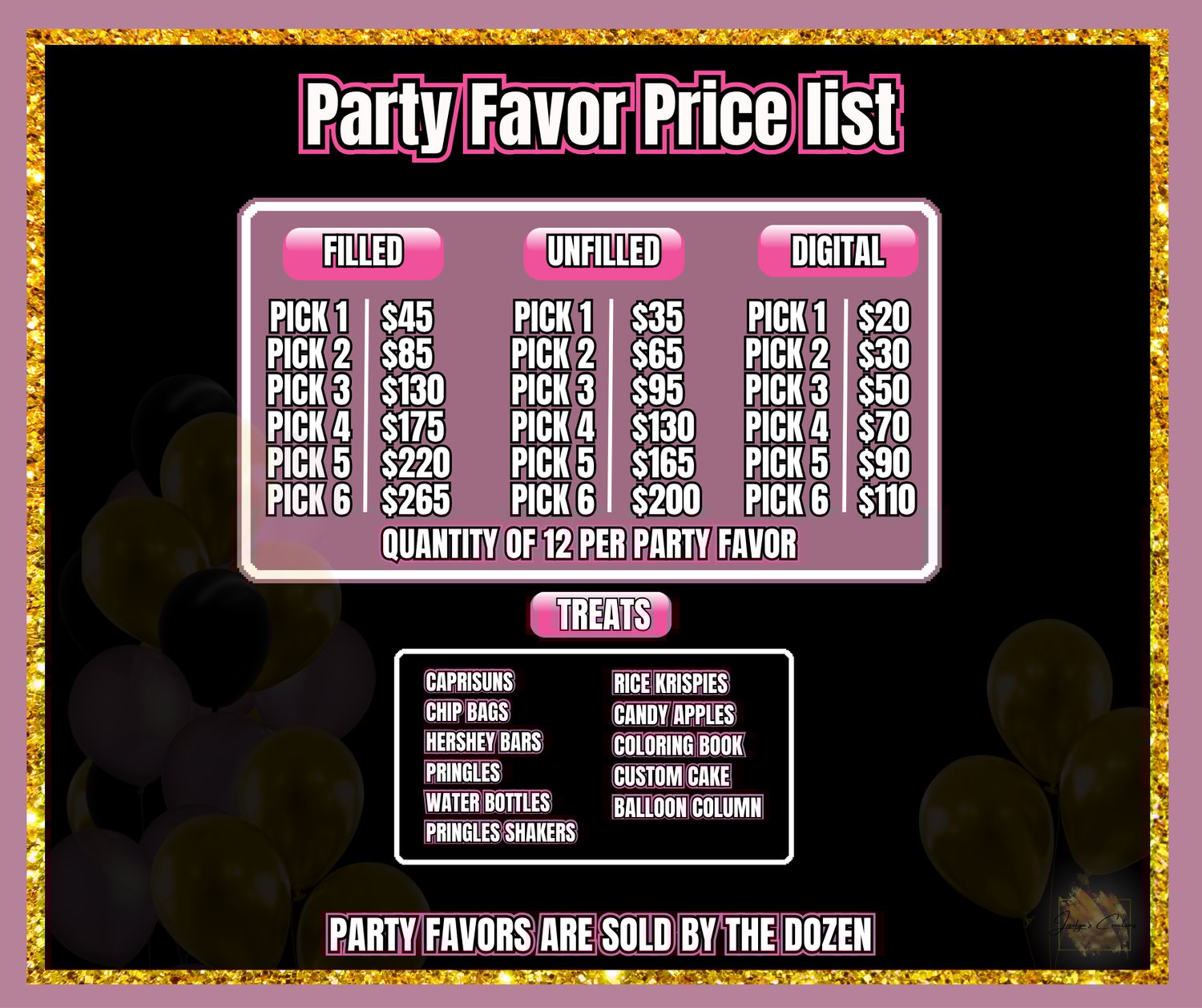 🖤 Party Favor Menu – Lists each item (sold by the dozen) with prices