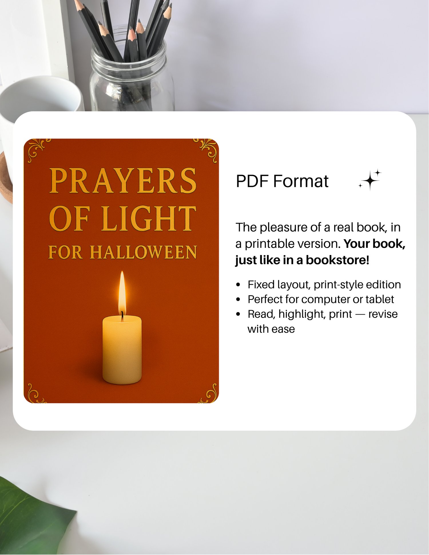 ✓ Prayers of Light – For the Night of Souls: For Halloween and All Saints’ Day ✓ Two formats included: EPUB + PDF ✓ Elegant layout, readable on all devices (Kindle, Kobo, iPad, phone, tablet…) ✓ Smooth, immersive reading — designed for meditation and reflection