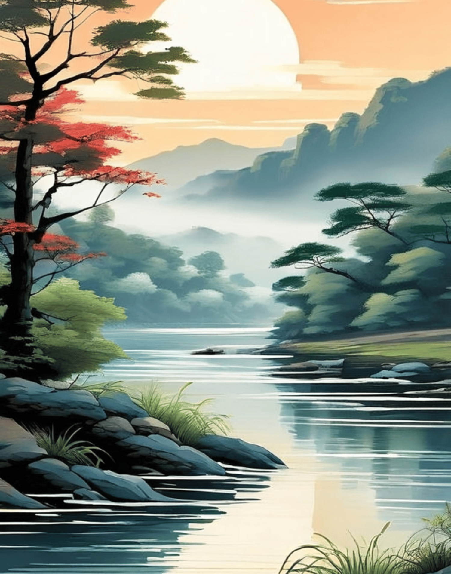 Japanese Painting, Vintage Village, Top Art, Nostalgic Rural life, Nature, Cool Nature, Beautiful Nature, Sunrise, Natural Landscape, Wall Art, Digital Art.