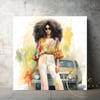 Watercolor 1970's Bohemian Woman Digital Print with Afro, Vintage Car, Bohemian Hippie Design with Abstract Background, Instant Download