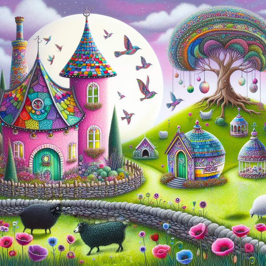 Quirky small half moon houses made of bright colourful tiny pink & blue bricks with mosaic glass tile roofs. A field with black curly sheep by a stone wall. Chickens & a fancy coup. There are poppies everywhere. A wishing well, pond & twisty trees, with glass bird houses & there are humming birds.