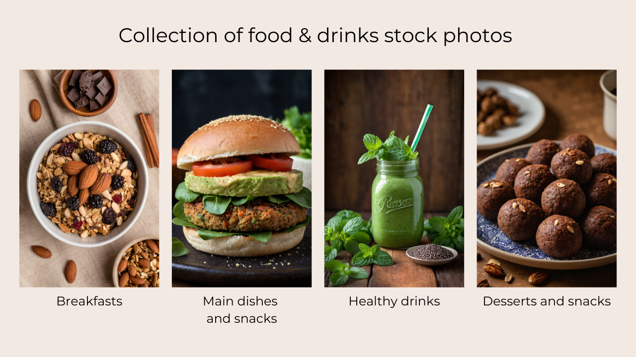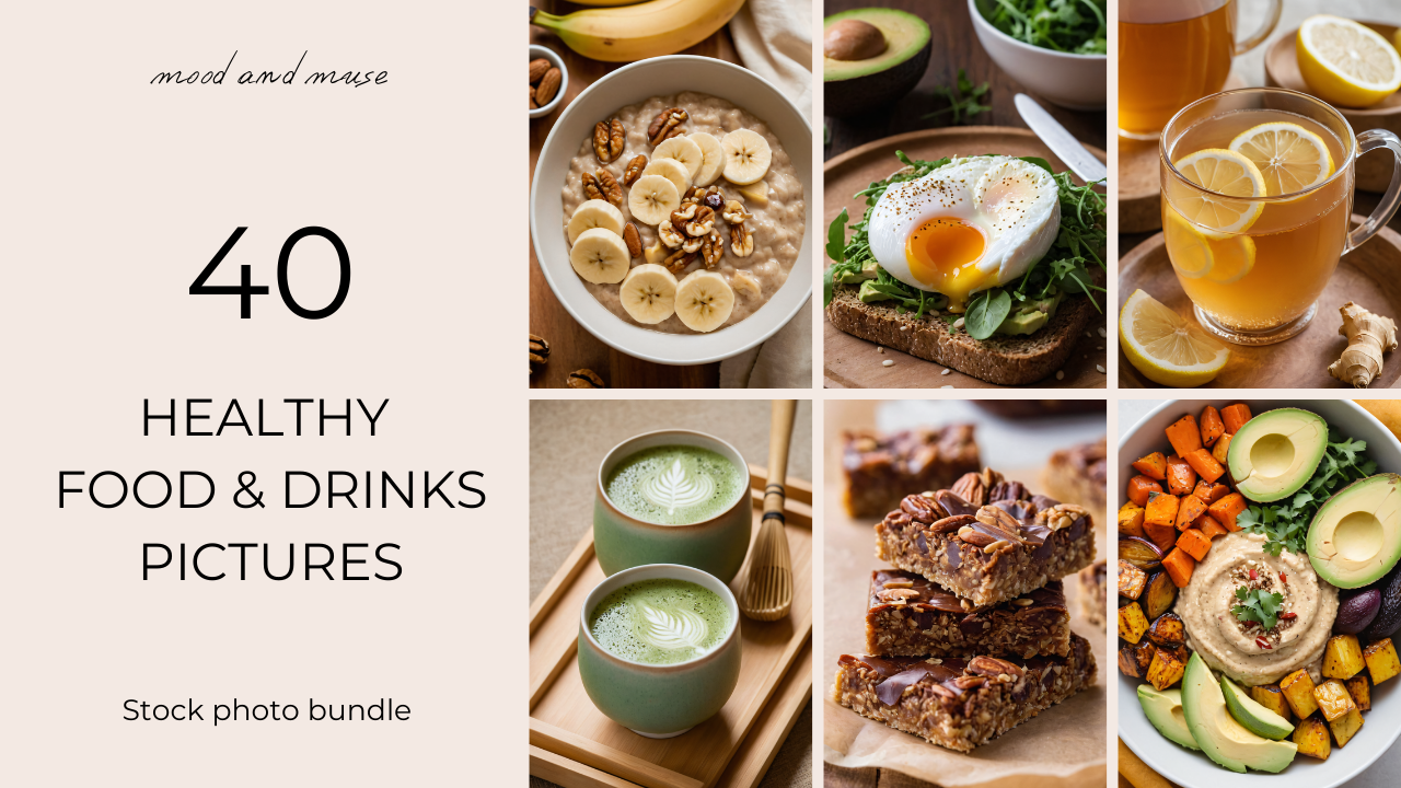 Enhance your content with this exclusive AI-generated stock photo pack featuring 40 high-quality images of healthy food and drinks. Designed for Pinterest, Instagram Stories, blogs, and marketing materials, this collection captures the vibrant and aesthetic essence of nutritious meals and beverages.