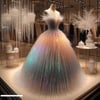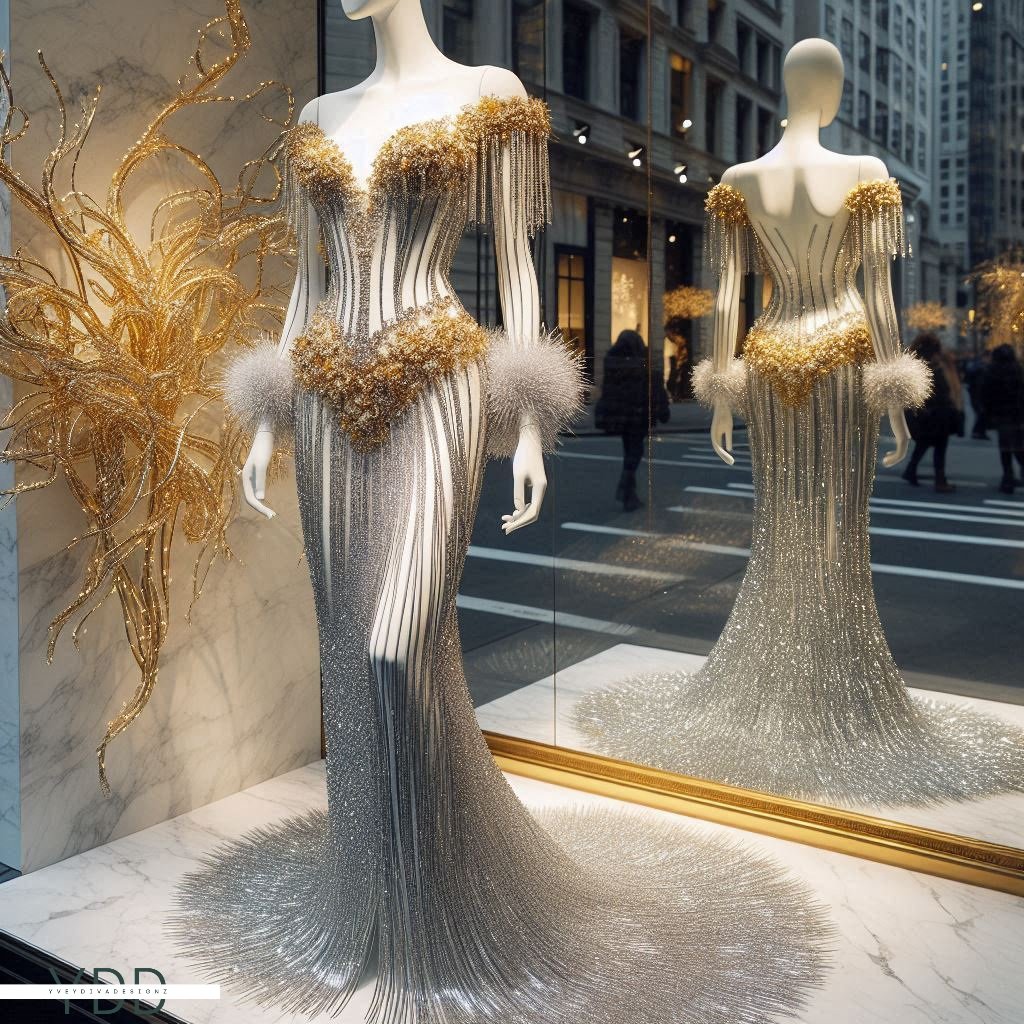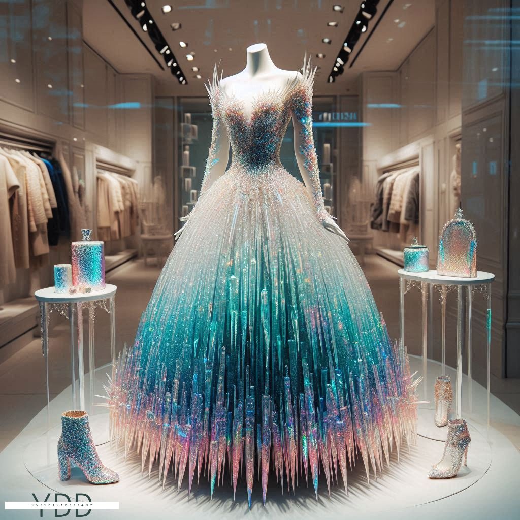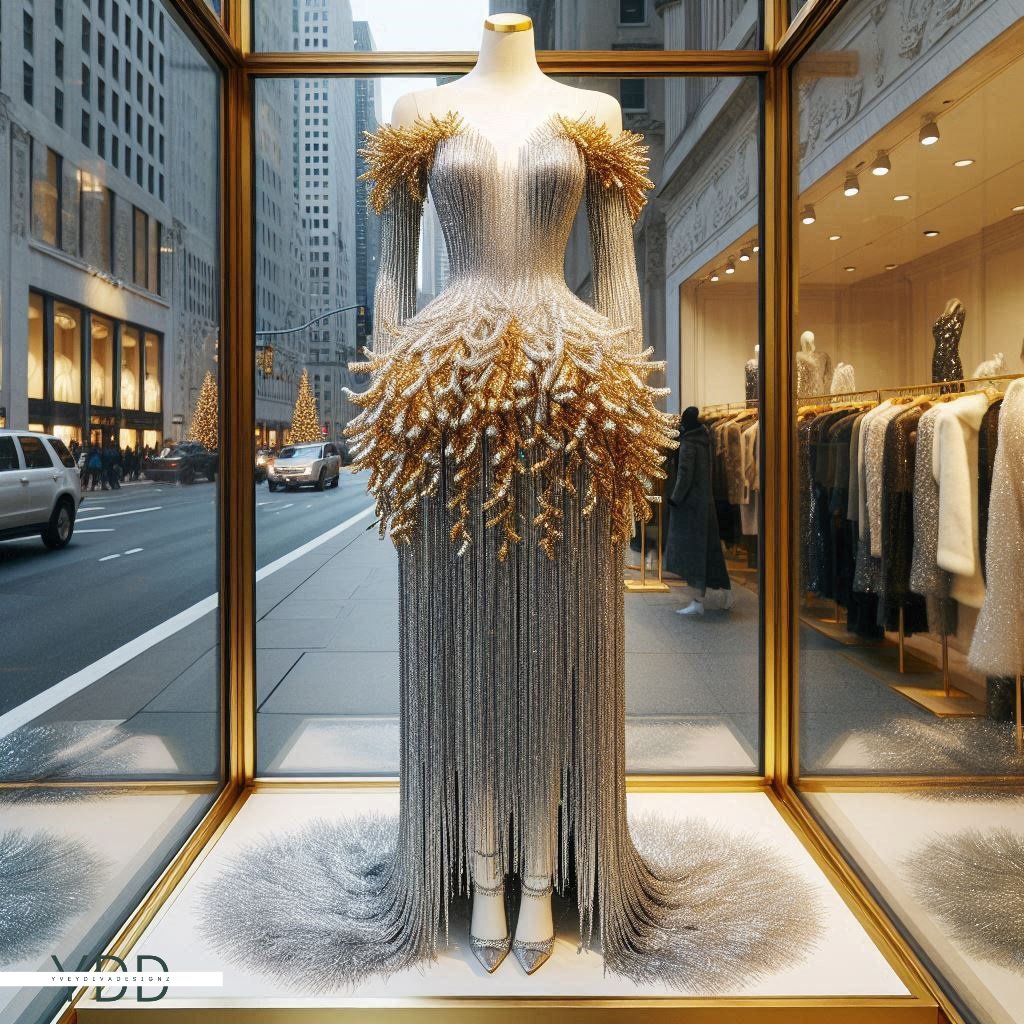 Step into a winter wonderland with this mesmerizing A-line dress, a shimmering fusion of crystalline icicles, sparkling tinsel, and festive garland. This avant-garde creation captures the magic of the season, radiating icy sophistication with every step.