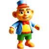Finally, there's a charming fellow with a round face and endearing smile. Dressed in a blue jacket, yellow vest, and green shorts, he's the very picture of a friendly neighborhood character.