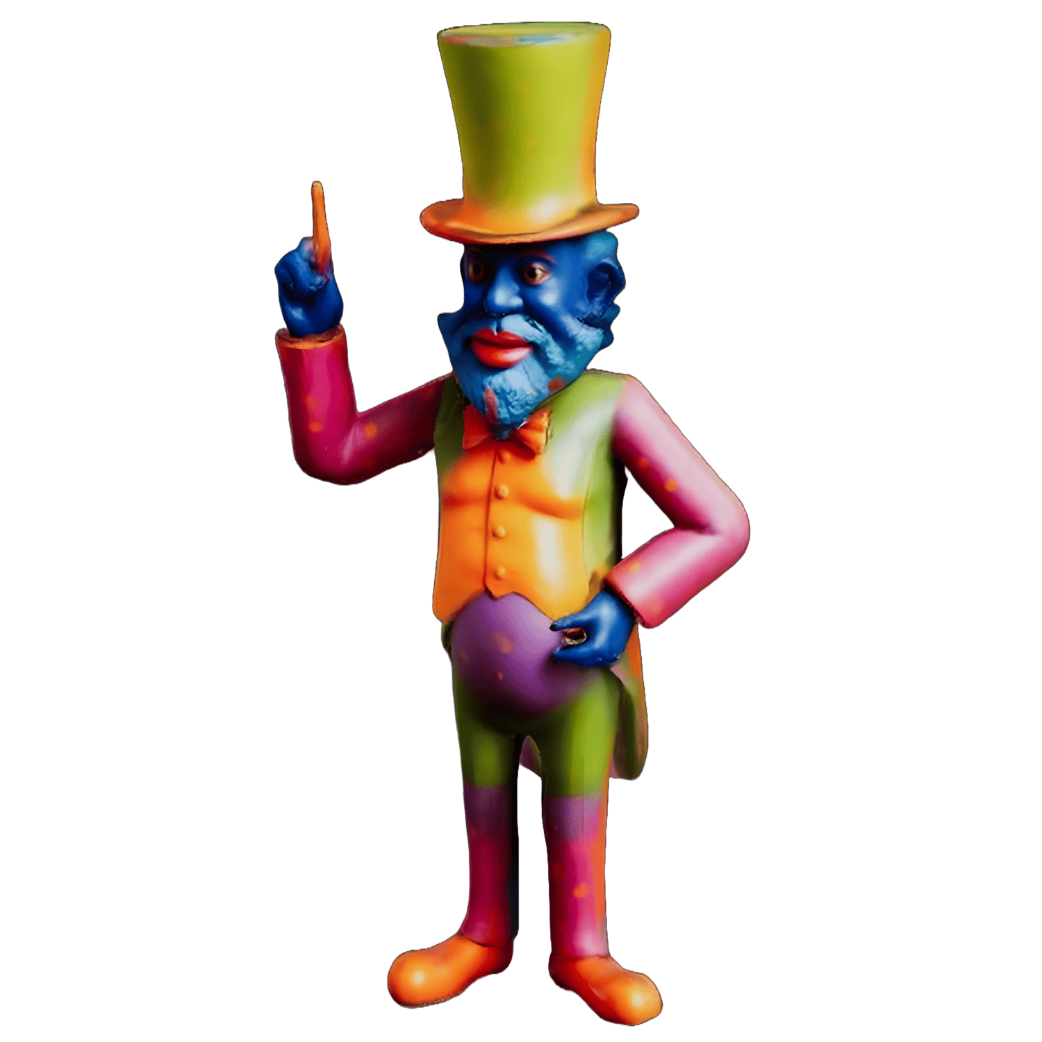 Next up is a dapper gentleman in a top hat, sporting a bold, multicolored design. With his finger raised and a mischievous grin, he looks ready to share a clever quip or two.