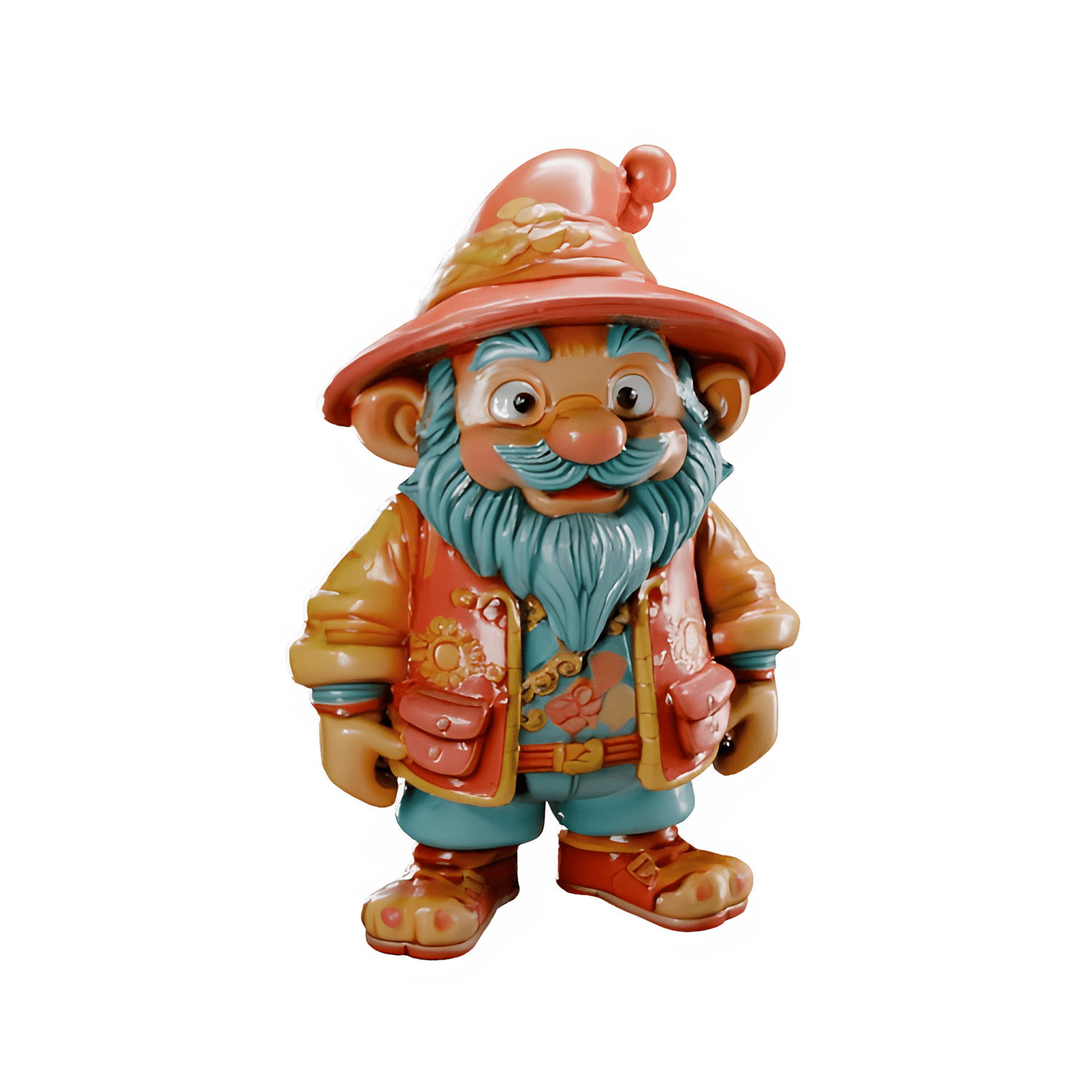 First, we have a jolly garden gnome with a bushy blue beard and a cheerful expression. His orange hat and jacket are adorned with playful patterns, perfect for bringing some magic to your garden or shelf.