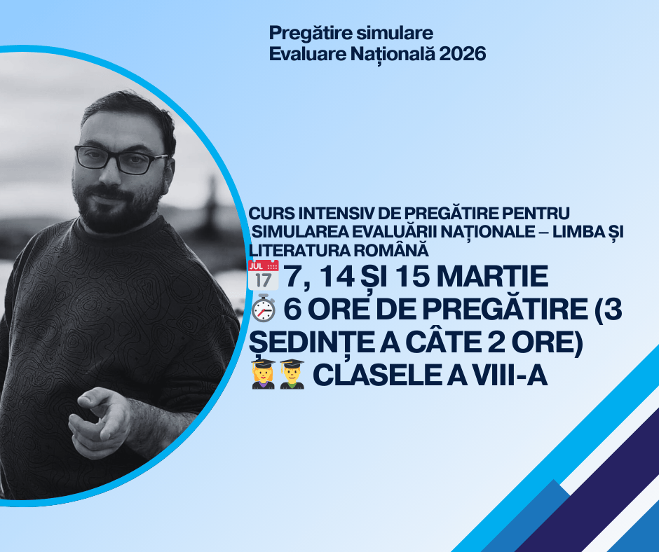 Acest curs intensiv este conceput special pentru elevii care se pregătesc pentru Simularea Evaluării Naționale, având ca obiectiv clar înțelegerea cerințelor de examen, creșterea siguranței în rezolvare și obținerea unui rezultat cât mai bun.
