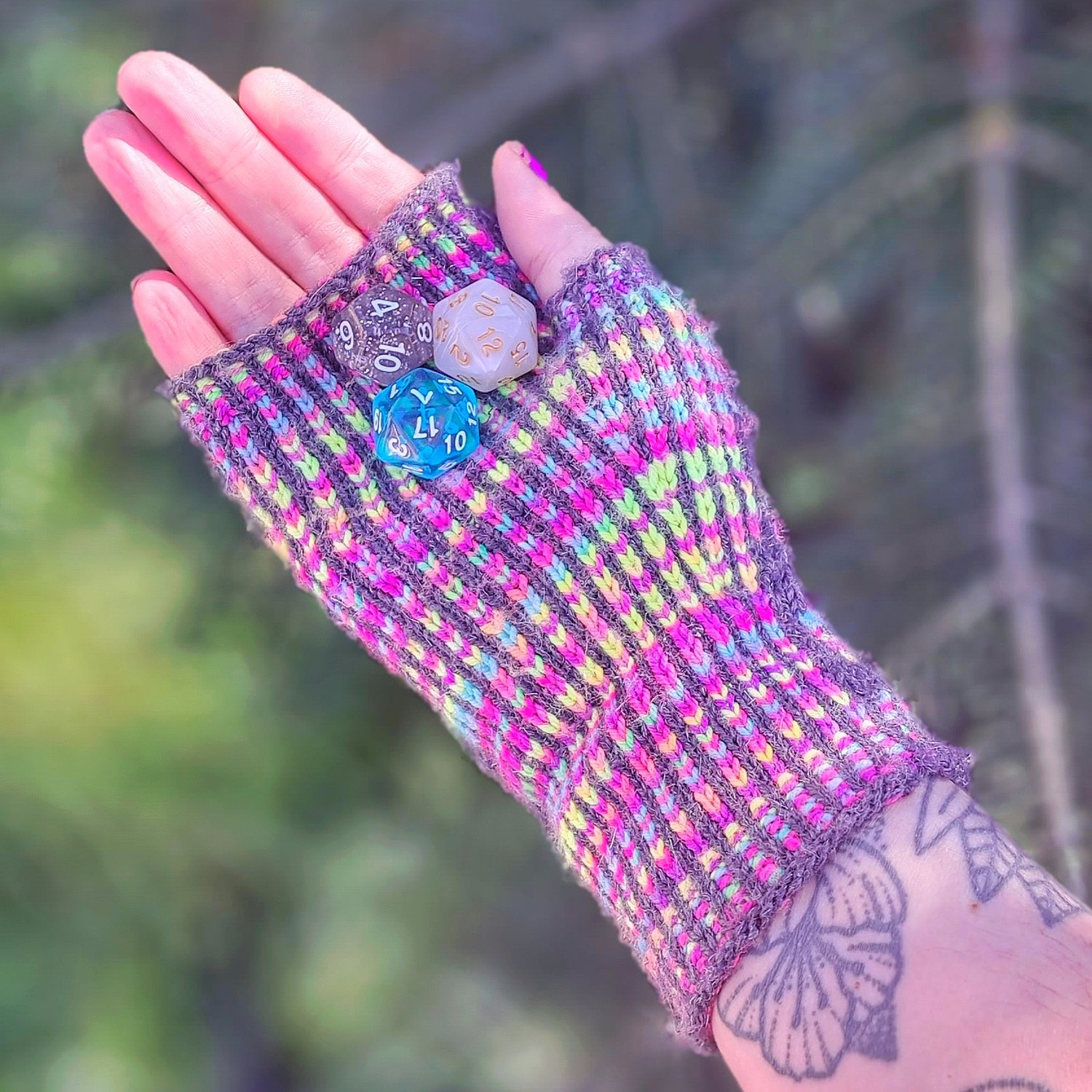Embrace the chaos and magic of the dice to create your own unique gothic skull gloves. These stranded knit fingerless gloves weave together warmth and goth style with every stitch. Skulls hauntingly decorate the front. Whilst the palm features a pinstripe pattern which adds extra stretch to the fabric. The perfect gloves to decorate your hands whether you are at a gig, exploring haunted places or just embracing your dark aesthetic.