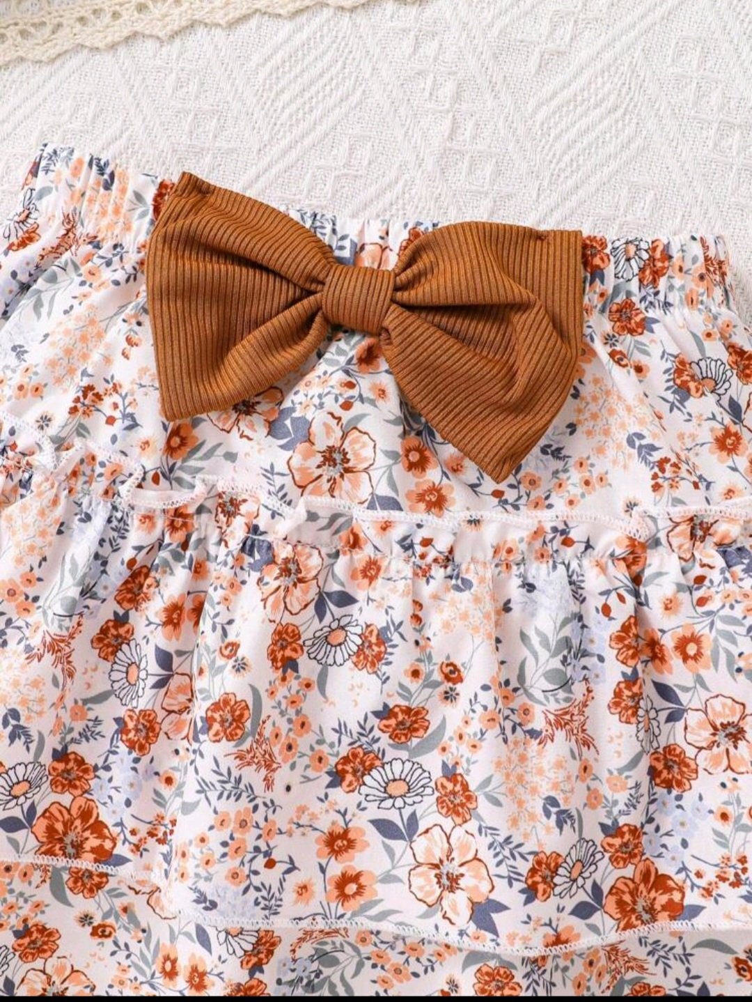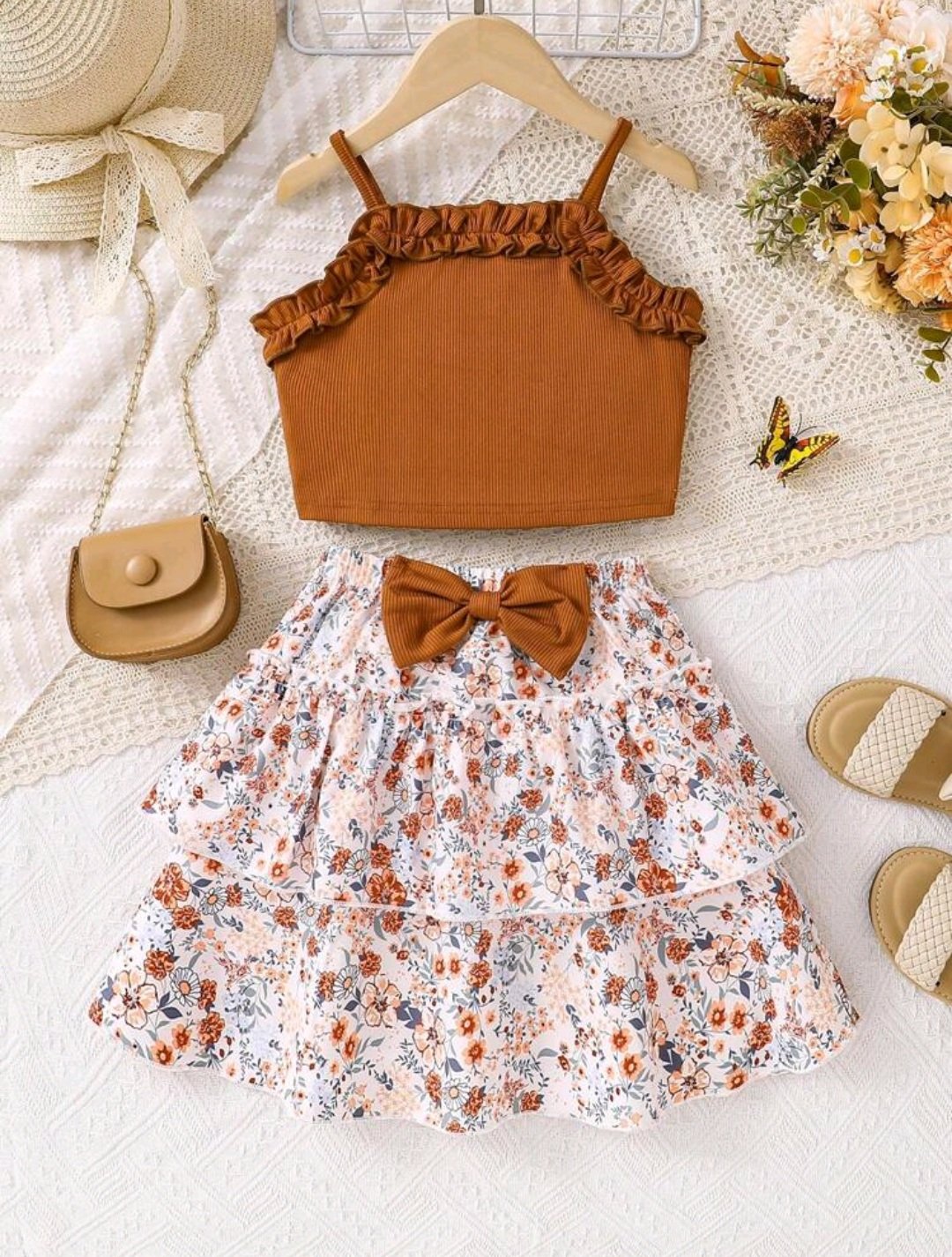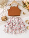 2pcs/Set Coffe Brown Young Girl Fashion Summer Outfit: Solid Color Knitted Camisole Top + Butterfly Ditsy Floral Elastic Waist Skirt/Young Girl Soft Breathable Casual Outdoor/Party Dress Set