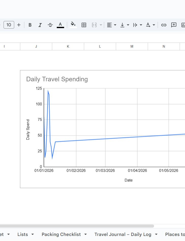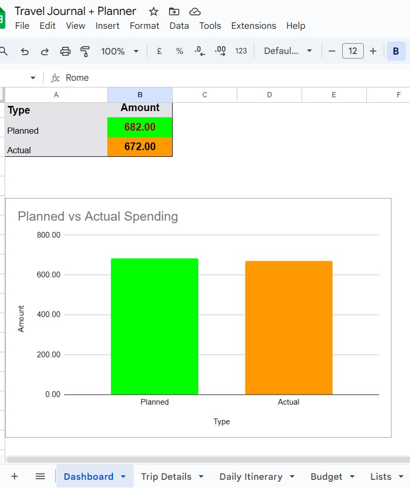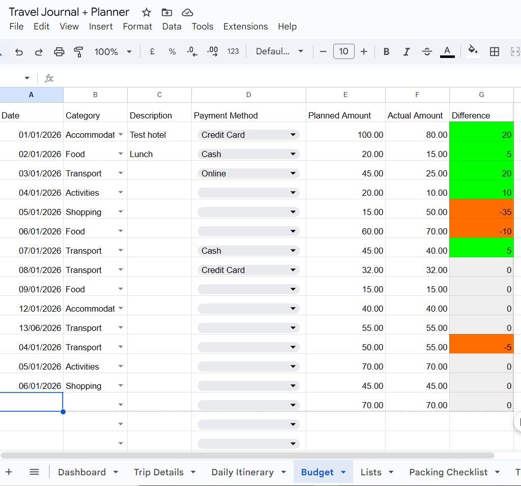 Travel Budget Tracker – Track Planned vs. Actual spending across categories like Accommodation, Food, Transport, and Activities. Automatically calculates totals and remaining budget with charts.