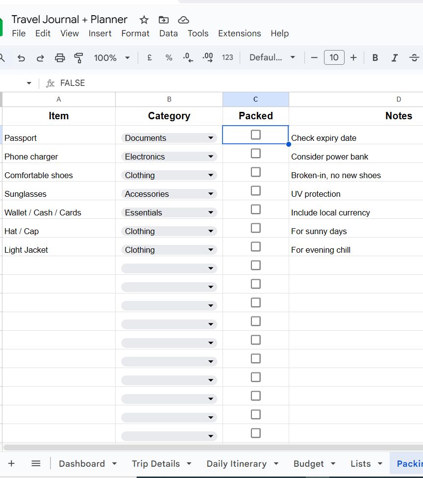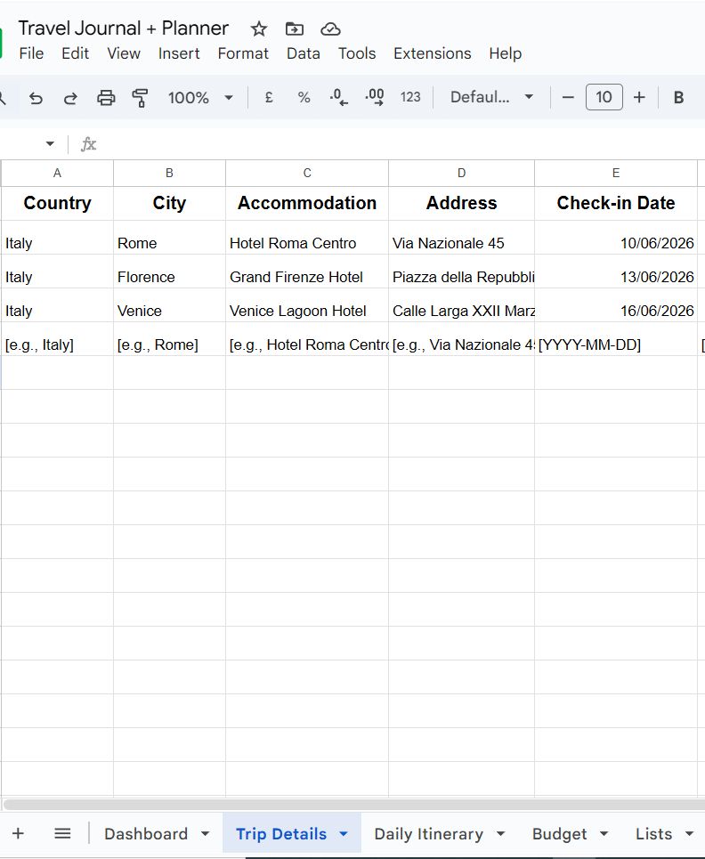 2. Fill in your Trip Details, Daily Itinerary, Budget, and Packing Checklist.