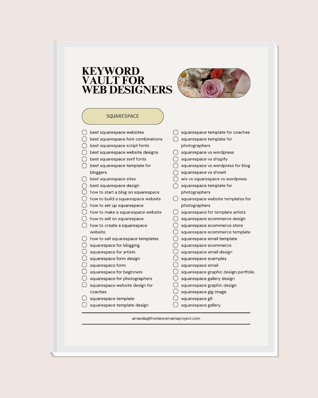 This keyword vault is carefully curated for web designers, featuring keywords perfect for promoting your portfolio, sharing educational content, and more. Plus, the included video tutorial walks you through how to find additional keywords to fill any gaps. If you’re unsure whether this is the right fit for your needs, feel free to email me at amanda@freelancemamaproject.com.