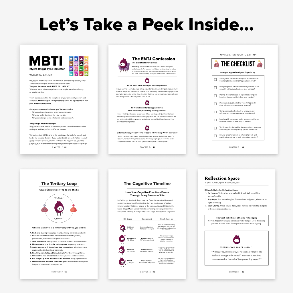 Designed specifically for the ENTJ's mind, this self-discovery guide breaks down the inner structure behind your thoughts, emotional patterns, strengths, blind spots, and growth path with depth, clarity, and real-world application.