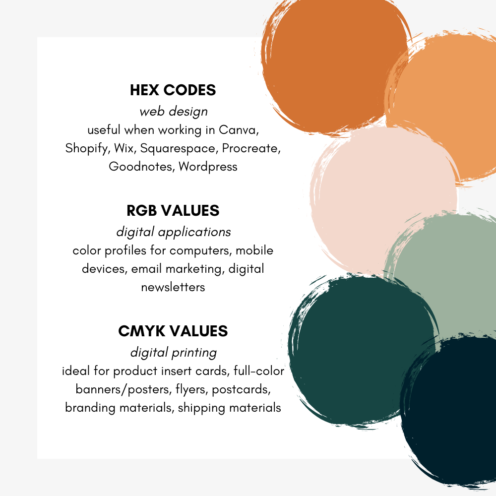 + Detailed Hex Codes, RGB, and CMYK values for each color