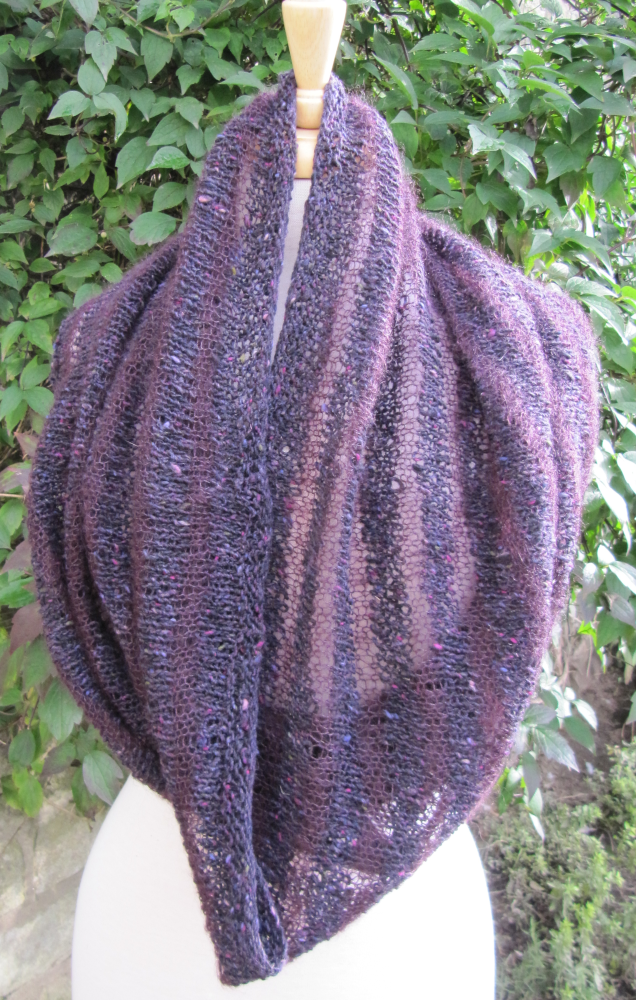These four cowls use 4ply/fingering or Aran weight yarns paired with silk-mohair or silk-alpaca to give light, airy, warm neckwear. Three are designed with 4ply, the fourth uses Aran weight, and each is a great way of using up stash to great effect. They are all knit at a large gauge to trap air and create a cosy accessory.