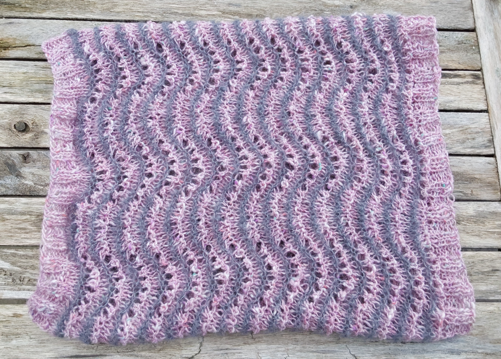 Wavy is knit in 4ply/fingering and uses the silk-mohair as a contrasting stripe in the Old Shale pattern, a long-time favourite lacy design.