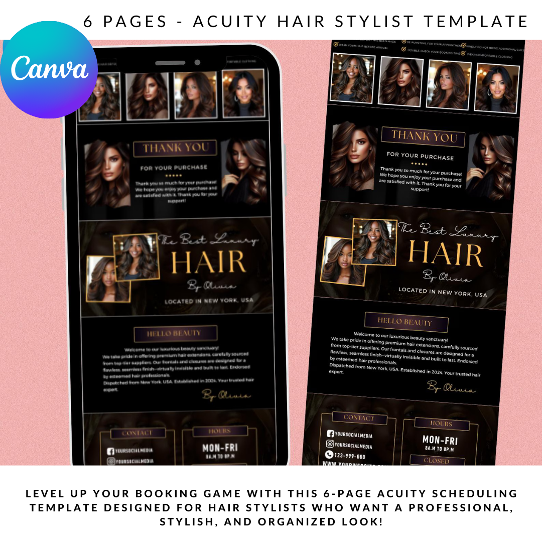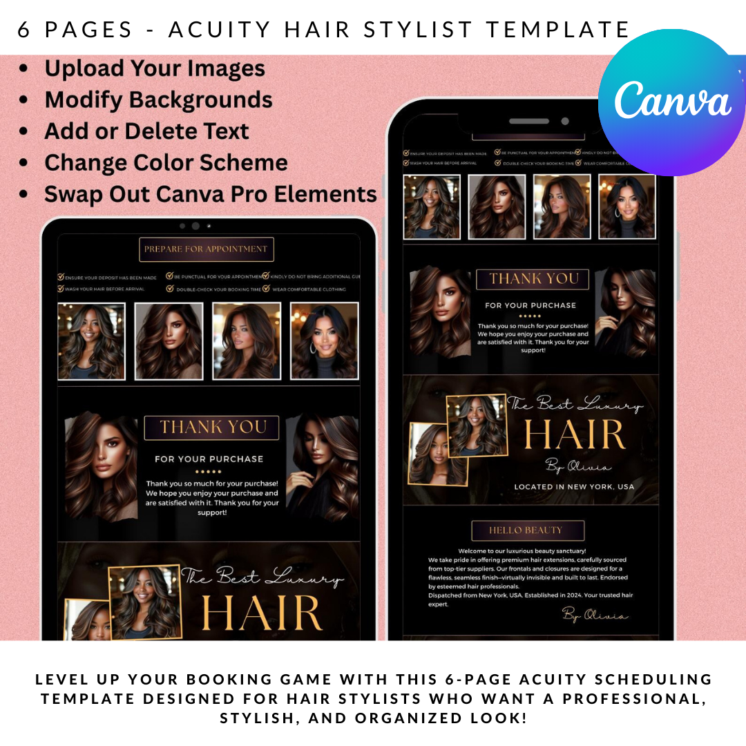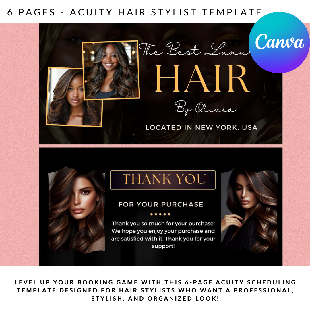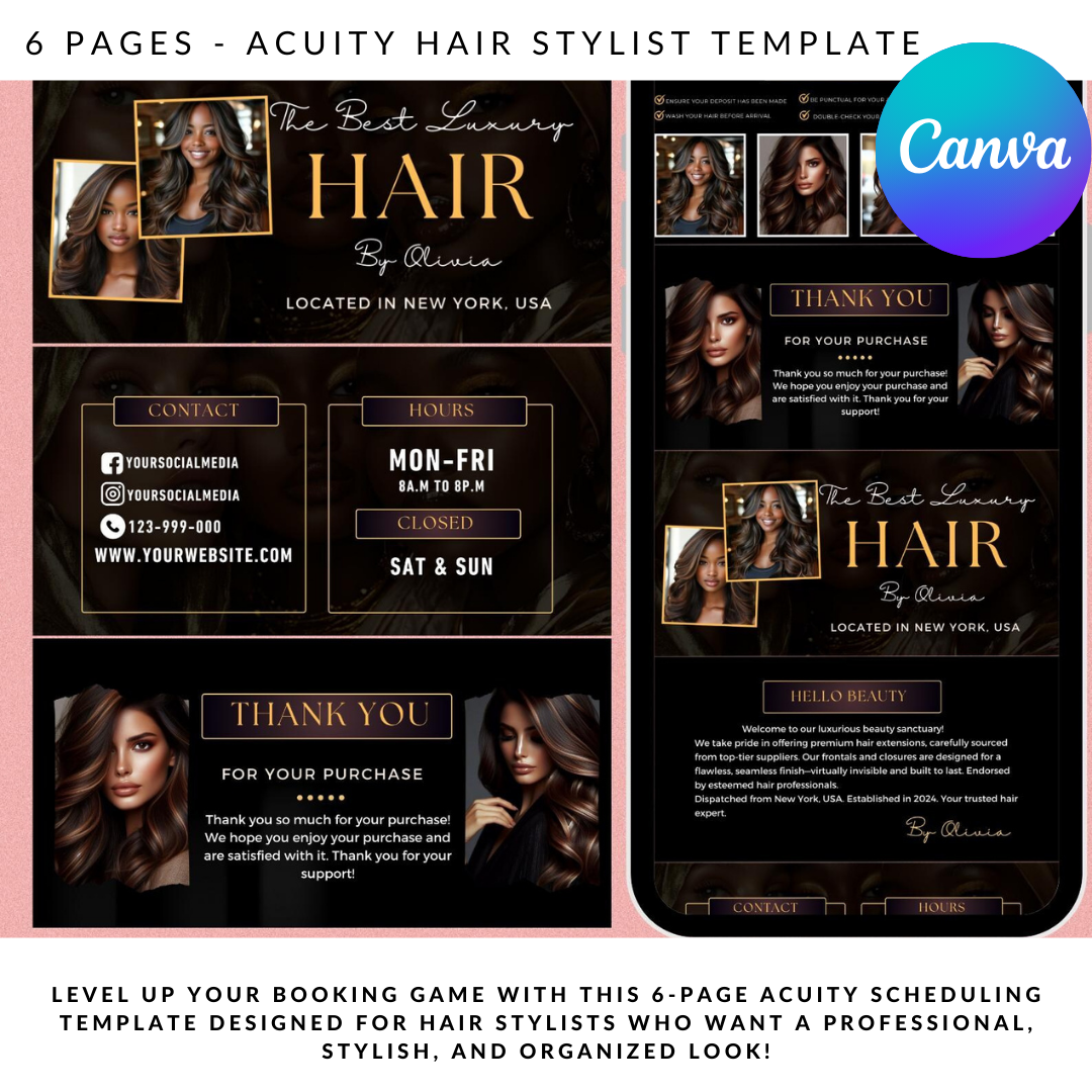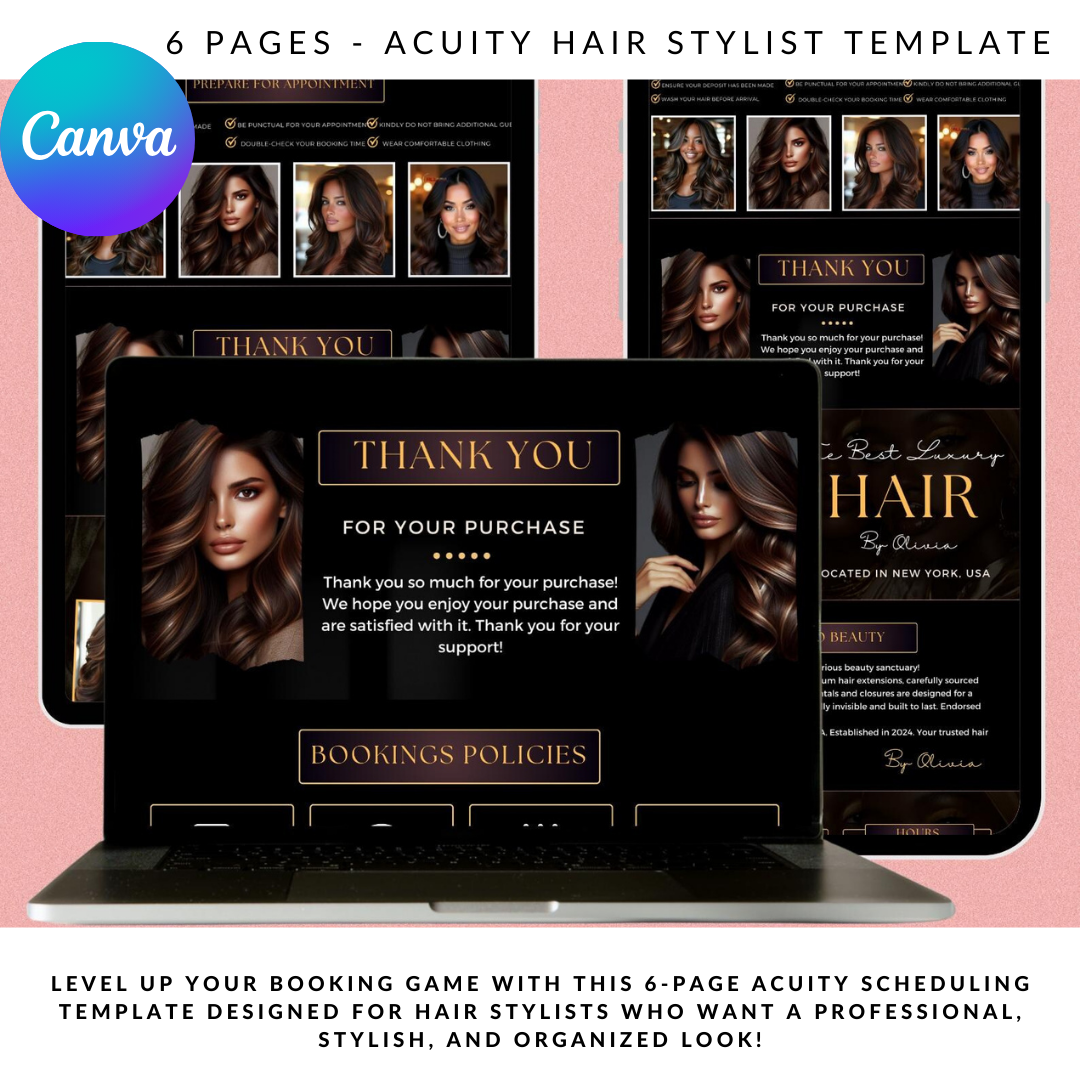 Level up your booking game with this 6 page Acuity Scheduling Template designed for hair stylists who want a professional, stylish, and organized look! From showcasing services to booking details, this template is fully customizable in Canva so you can adjust it to fit your brand and vibe.